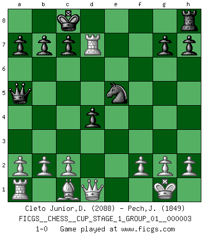 Last move : 1-0 2019 December 22 12:0:26 [Event "FICGS__CHESS__CUP_STAGE_1_GROUP_01__000003"] [Site "FICGS"] [Date "2019.11.02"] [Round "1"] [White "Cleto Junior,Dirceu"] [Black "Pech,Jaroslav"] [Result "1-0"] [WhiteElo "2088"] [BlackElo "1849"] 1.e4 e5 2.Nf3 Nc6 3.Bc4 Nf6 4.d4 exd4 5.O-O Nxe4 6.Re1 d5 7.Bxd5 Qxd5 8.Nc3 Qa5 9.Nxe4 Be6 10.Neg5 O-O-O 11.Nxe6 fxe6 12.Rxe6 Be7 13.Ne5 Nxe5 14.Rxe7 Rd7 15.Rxd7 1-0 This chess game has been lost on time (started : 2019.11.02 13:52:22) Two knights defense Kingside Castling by player White (move 5) Queenside Castling by player Black (move 10) Player White won this chess game. Follow this game move after move (download)Checkers is for tramps. (Paul Morphy) Der Freibauer hat für mich eine Seele, genau wie der Mensch, Wünsche, die unerkannt in ihm schlummern, und Befürchtungen, von deren Existenz er selbst kaum ahnt. (Aaron Nimzowitsch) Todos los jugadores de Ajedrez deberían tener un pasatiempo. (Savielly Tartakower) Je ne crois pas en la psychologie, je crois aux bons coups. (Robert Fischer) No, I am still playing. (Anatoly Karpov)