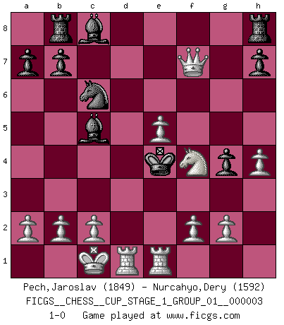 Last move : 1-0 2020 January 9 4:25:12 [Event "FICGS__CHESS__CUP_STAGE_1_GROUP_01__000003"] [Site "FICGS"] [Date "2019.11.02"] [Round "1"] [White "Pech,Jaroslav"] [Black "Nurcahyo,Dery"] [Result "1-0"] [WhiteElo "1849"] [BlackElo "1592"] 1.e4 e5 2.Nf3 d6 3.d4 f6 4.Bc4 Ne7 5.dxe5 dxe5 6.Bf7+ Kxf7 7.Qxd8 Nbc6 8.Qxc7 g5 9.Nc3 Rb8 10.Bxg5 fxg5 11.Nxe5+ Kf6 12.h4 g4 13.Nxc6 Nxc6 14.Nd5+ Ke6 15.Nf4+ Kf6 16.O-O-O Bc5 17.e5+ Kf5 18.Qf7+ Ke4 19.Rhe1+ 1-0 Philidor's defense Queenside Castling by player White (move 16) Player White won this chess game. Follow this game move after move (download)Bobby is the most misunderstood, misquoted celebrity walking the face of this earth. (Yasser Seirawan) Wenn es im Universum noch irgendwo intelligente Lebewesen gibt, dann kennen sie Go. (Emanuel Lasker) Personalmente, yo prefiero mirar hacia el futuro en donde un programa de computadora gane el título mundial de Ajedrez. La humanidad necesita una lección de humildad. (Richard Dawkings) Une platitude souvent récitée à propos des Echecs est qu'une des choses les plus difficiles à réaliser est de gagner une position gagnante. Cela ne manque pas de sens mais, pour ma part, j'ai toujours trouvé plus difficile de gagner une position perdante. (Tim Krabbe) Luck has a peculiar habit of favoring those who don't depend on it. (Author unknown)