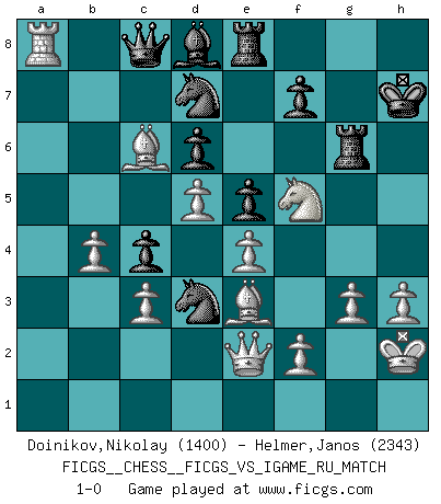 Last move : 1-0 2007 November 18 17:14:40 [Event "FICGS__CHESS__FICGS_VS_IGAME_RU_MATCH"] [Site "FICGS"] [Date "2007.06.27"] [Round "2"] [White "Doinikov,Nikolay"] [Black "Helmer,Janos"] [Result "1-0"] [WhiteElo "1400"] [BlackElo "2343"] 1.e4 e5 2.Nf3 Nc6 3.Bb5 a6 4.Ba4 Nf6 5.O-O b5 6.Bb3 Be7 7.Re1 d6 8.c3 O-O 9.h3 Nb8 10.d4 Nbd7 11.Nbd2 Bb7 12.Bc2 Re8 13.Nf1 Bf8 14.Ng3 g6 15.a4 c5 16.d5 c4 17.Bg5 h6 18.Be3 Nc5 19.Qd2 Kh7 20.Ra3 Qc7 21.Rea1 Bg7 22.Nh4 Rec8 23.Kh2 Nfd7 24.Nhf5 gxf5 25.Nxf5 Rg8 26.Bxh6 Bf6 27.axb5 Rg6 28.Be3 Rag8 29.bxa6 Bxa6 30.g3 Bb5 31.Ra7 Qb8 32.Qe2 Re8 33.R7a5 Bd8 34.Rxb5 Qxb5 35.b4 Nd3 36.Ba4 Qb7 37.Bc6 Qc8 38.Ra8 1-0 Ruy Lopez : 5.O-O Kingside Castling by player White (move 5) Kingside Castling by player Black (move 8) Player White won this chess game. Follow this game move after move (download)When you see a good move, look for a better one. (Emanuel Lasker) Weshalb minderdergeübte Spieler mit g2-g4 beginnen? Die betreffenden sind unschlüssig, ob sie nun rechts (h4) oder links (f4) beginnen sollen, und in ihrer Ratlosigkeit entschliessen sie sich nach guter Bürgerart dazu, den goldenen Mittelweg zu wählen. (Aaron Nimzowitsch) Tu cuerpo tiene que estar en óptima condición. Tu Ajedrez se deteriora como lo hace tu cuerpo. No puedes separar la mente y el cuerpo. (Bobby Fischer) Aucun coup ne doit être joué sans but. (Pedro Damiano) When it is a question of money, everybody is of the same religion. (Voltaire)