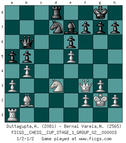 Last move : 1/2-1/2 2020 February 24 7:22:40 [Event "FICGS__CHESS__CUP_STAGE_1_GROUP_02__000003"] [Site "FICGS"] [Date "2019.11.02"] [Round "1"] [White "Duttagupta,Aniruddha"] [Black "Bernal Varela,Nelson"] [Result "1/2-1/2"] [WhiteElo "2081"] [BlackElo "2565"] 1.e4 e6 2.d3 d5 3.Qe2 Be7 4.Nf3 c5 5.g3 Nf6 6.Bg2 Nc6 7.O-O O-O 8.e5 Nd7 9.c4 a6 10.Nc3 Nd4 11.Nxd4 cxd4 12.Nd1 dxc4 13.dxc4 Rb8 14.b3 b5 15.Nb2 Qb6 16.Rd1 Bb4 17.c5 Bxc5 18.Nd3 Be7 19.Bb2 Rd8 20.Ne1 Nf8 21.Qd2 d3 22.Nxd3 Bb7 23.Qe3 Qa5 24.a3 Bxg2 25.Kxg2 Rd7 26.Qf3 Qb6 27.b4 Rbd8 28.Nf4 a5 29.Rxd7 Nxd7 30.Nd3 1/2-1/2 French : King's Indian attack Kingside Castling by player White (move 7) Kingside Castling by player Black (move 7) This chess game ended in a draw. Follow this game move after move (download)The Chess pieces are the block alphabet which shapes thoughts; and these thoughts, although making a visual design on the chessboard, express their beauty abstractly, like a poem. (Marcel Duchamp) Mein Gehirn das ist mein zweitwichtigstes Organ [Aus dem Film: Der Schläfer]. (Woody Allen) El tablero es el mundo, las piezas es el fenomeno del universo, las reglas del juego son lo que llamamos leyes de la naturaleza y el jugador del lado opuesto, se encuentra oculto a nuestra vista. (Thomas Huxley) La tactique, c'est ce que vous faites quand il y a quelque chose à faire; la stratégie, c'est ce que vous faites quand il n'y a rien à faire. (Savielli Tartacower) Every now and then a man's mind is stretched by a new idea and never shrinks back to its former dimensions. (Oliver Wendell Holmes, Sr.)