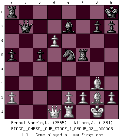 Last move : 1-0 2020 March 3 15:30:22 [Event "FICGS__CHESS__CUP_STAGE_1_GROUP_02__000003"] [Site "FICGS"] [Date "2019.11.02"] [Round "1"] [White "Bernal Varela,Nelson"] [Black "Wilson,Jaimie"] [Result "1-0"] [WhiteElo "2565"] [BlackElo "1881"] 1.Nf3 Nf6 2.c4 e6 3.g3 b6 4.Bg2 Bb7 5.d4 Be7 6.O-O O-O 7.Re1 c5 8.d5 exd5 9.Nh4 Ne4 10.cxd5 Bxh4 11.Bxe4 Bf6 12.Nd2 d6 13.Bg2 Nd7 14.Ne4 Be7 15.Bf4 Qc7 16.Rc1 a6 17.b4 a5 18.bxc5 bxc5 19.g4 f5 20.gxf5 Rxf5 21.Bg3 Kh8 22.Nd2 Ne5 23.Nb3 Qb6 24.Nxc5 dxc5 25.Rb1 Qa7 26.Rxb7 Qxb7 27.d6 1-0 Reti Opening Kingside Castling by player White (move 6) Kingside Castling by player Black (move 6) Player White won this chess game. Follow this game move after move (download)Chess is thirty to forty percent psychology. You don't have this when you play a computer. I can't confuse it. (Judith Polgar) Du kannst im Schach nur gut werden, wenn du das Spiel liebst. (Robert James Fischer) Fischer era un maestro de claridad y un Rey del posicionamiento astuto. Sus oponentes podían ver hacia donde se dirigía pero eran impotentes para detenerlo. (Bruce Pandolfini) Les échecs sont un jeu par leur forme, un art par leur essence et une science par sa difficulté d'acquisition. Ils peuvent vous procurer autant de plaisir qu'un bon livre ou une belle musique, mais vous n'aurez une réelle joie que si vous arrivez à bien jouer. (Tigran Petrosian) The only thing that matters is the evidence. (Horatio Caine, C.S.I. Miami)
