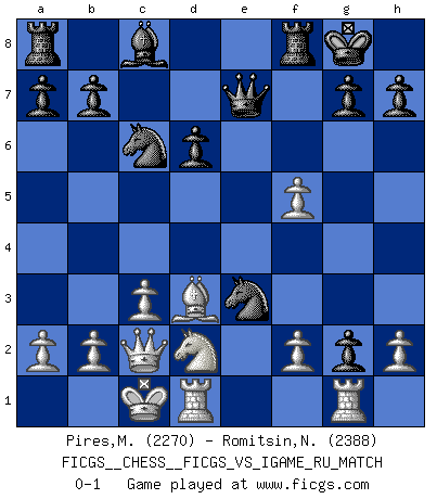 Last move : 0-1 2007 September 15 2:23:9 [Event "FICGS__CHESS__FICGS_VS_IGAME_RU_MATCH"] [Site "FICGS"] [Date "2007.06.27"] [Round "1"] [White "Pires,Miguel"] [Black "Romitsin,Nikolay Sergeevich"] [Result "0-1"] [WhiteElo "2270"] [BlackElo "2388"] 1.e4 e5 2.Nf3 Nc6 3.Bb5 Bc5 4.c3 f5 5.exf5 e4 6.d4 exf3 7.dxc5 Qe7+ 8.Be3 fxg2 9.Rg1 Nf6 10.Nd2 d5 11.cxd6 cxd6 12.Qc2 O-O 13.O-O-O Ng4 14.Bd3 Nxe3 0-1 This chess game has been lost on time (started : 2007.06.27 20:18:37) Ruy Lopez : Cordel gambit Kingside Castling by player Black (move 12) Queenside Castling by player White (move 13) Player Black won this chess game. Follow this game move after move (download)Chess holds its master in its own bonds, shackling the mind and brain so that the inner freedom of the very strongest must suffer. (Albert Einstein) Rubinstein ist ein Turmendspiel, welches die Götter vor tausenden von Jahren begannen. (Savielly Grigorievitsch Tartakower) Sin errores no puede haber brillantez. (Emanuel Lasker) Le joueur d'Echecs qui veut atteindre le top est obligé de développer son propre credo créatif. Alexeï Stepanovicth Souétine. Il est facile d'écrire des livres ! Ce qui est difficile, c'est de jouer ! (Alexeï Stepanovicth Souétine) I live to kill Traxler counterattack. (Ilmars Cirulis)