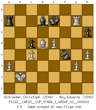 Last move : 1-0 2020 January 13 15:4:4 [Event "FICGS__CHESS__CUP_STAGE_1_GROUP_02__000003"] [Site "FICGS"] [Date "2019.11.02"] [Round "1"] [White "Schroeder,Christoph"] [Black "Rey,Eduardo"] [Result "1-0"] [WhiteElo "2244"] [BlackElo "1500"] 1.d4 Nf6 2.c4 e5 3.dxe5 Ng4 4.Bf4 Nc6 5.Nf3 Bb4+ 6.Nc3 Qe7 7.Qb3 a5 8.e3 Ngxe5 9.Nxe5 Nxe5 10.O-O-O c6 11.a3 Bc5 12.Ne4 O-O 13.Nxc5 Qxc5 14.Qc3 Re8 15.Be2 d6 16.Qd4 Bg4 17.f3 Bf5 18.Rhe1 f6 19.e4 Bg6 20.Qxd6 Qb6 21.Qd4 c5 22.Qd6 Nc6 23.Be3 Qb3 24.Qd3 Qxd3 25.Rxd3 b6 26.Rd6 Rac8 27.Bf4 Bf7 28.Red1 Nd4 29.Bf1 Re6 30.Rxe6 Bxe6 31.Be3 Nc6 32.Rd6 Kf7 33.g3 Rc7 34.h4 h6 35.b3 Ke7 36.Bf4 Bd7 37.Rxf6 Rb7 38.Rg6 Kf7 39.Rd6 Nd4 40.Kb2 a4 41.bxa4 Nxf3 42.Kc3 Bxa4 43.Bg2 Nd4 44.e5 Ra7 45.Rxb6 Bd7 46.Bd5+ Ke7 47.Kb2 Ne2 48.Rg6 Nxf4 49.Rxg7+ 1-0 Budapest : Rubinstein variation Queenside Castling by player White (move 10) Kingside Castling by player Black (move 12) Player White won this chess game. Follow this game move after move (download)I had a toothache during the first game. In the second game I had a headache. In the third game it was an attack of rheumatism. In the fourth game, I wasn't feeling well. And in the fifth game? Well, must one have to win every game ? (Siegbert Tarrasch) Deine Wertungszahl - vorausgesetzt einige Jahre schachliche Anstrengung - entspricht etwa dem zehnfachen Deines IQ plus 1000. (Jonathan Levitt) Siempre es mejor sacrificar los hombres de tu oponente. (Savielly Tartakower) Le plus grand jeu de l'esprit jamais inventé, plus vous l'apprenez, plus vous y prenez du plaisir. (Garry Kasparov) How many people work in NATO Headquarters ? - About half of them. (Dirk Stikker, NATO general secretary)
