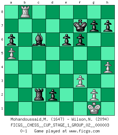Last move : 0-1 2020 January 23 19:36:31 [Event "FICGS__CHESS__CUP_STAGE_1_GROUP_02__000003"] [Site "FICGS"] [Date "2019.11.02"] [Round "1"] [White "Mohandoussaid,Malik"] [Black "Wilson,Norman"] [Result "0-1"] [WhiteElo "1647"] [BlackElo "2094"] 1.e4 c5 2.Nf3 e6 3.d4 cxd4 4.Nxd4 a6 5.Be2 Nf6 6.Bg5 Qa5+ 7.Bd2 Qb6 8.Bc1 Bc5 9.c3 Nc6 10.O-O Nxd4 11.cxd4 Bxd4 12.Nc3 Bxc3 13.bxc3 Nxe4 14.Qc2 d5 15.Be3 Qc7 16.c4 O-O 17.Rac1 Bd7 18.f3 Nd6 19.Bf4 Qc5+ 20.Kh1 Nxc4 21.Bxc4 Qxc4 22.Qf2 Qxf4 23.Qb6 Bb5 24.Rg1 Rac8 25.Rxc8 Rxc8 26.Qxb7 Qc7 27.Qxc7 Rxc7 28.Ra1 Rc2 29.h4 f6 30.a4 Bc6 31.a5 d4 32.Rb1 d3 33.Kg1 d2 34.Rb8+ Kf7 0-1 This chess game has been lost on time (started : 2019.11.02 13:52:23) Sicilian : Kan variation Kingside Castling by player White (move 10) Kingside Castling by player Black (move 16) Player Black won this chess game. Follow this game move after move (download)I feel as if I were a piece in a game of Chess, when my opponent says of it: That piece cannot be moved. (Soren Kierkegaard) Im Blitz ist es einfacher mit einer Figur weniger anzugreifen, als sich mit einer Mehrfigur zu verteidigen. (Mikhail Nekhemyevich Tal) Las Aperturas te enseñan aperturas. ¡Los Finales te enseñan Ajedrez!. (Stephan Gerzadowicz) Toute estimation doit être constamment réévaluée. (Jacob Estrin) A married woman is like a fish riding a bicycle. (Rodolfo d'Ettorre)