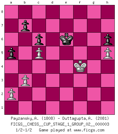Last move : 1/2-1/2 2020 February 12 14:36:47 [Event "FICGS__CHESS__CUP_STAGE_1_GROUP_02__000003"] [Site "FICGS"] [Date "2019.11.02"] [Round "1"] [White "Payzansky,Aleksey"] [Black "Duttagupta,Aniruddha"] [Result "1/2-1/2"] [WhiteElo "1808"] [BlackElo "2081"] 1.e4 c6 2.d4 d5 3.Nc3 dxe4 4.Nxe4 Bf5 5.Ng3 Bg6 6.h4 h6 7.Nf3 Nd7 8.h5 Bh7 9.Bd3 Bxd3 10.Qxd3 e6 11.Bd2 Ngf6 12.O-O-O Be7 13.Ne4 Nxe4 14.Qxe4 Nf6 15.Qe2 Qd5 16.c4 Qe4 17.Qxe4 Nxe4 18.Be3 Nd6 19.Ne5 Bf6 20.c5 Nf5 21.g4 Nxe3 22.fxe3 Bxe5 23.dxe5 Ke7 24.Rd6 f6 25.Rhd1 Rad8 26.Rxd8 Rxd8 27.Rxd8 Kxd8 28.exf6 gxf6 29.Kd2 Ke7 30.Ke2 f5 31.gxf5 exf5 32.Kf3 Kf6 33.Kf4 Ke6 34.e4 fxe4 35.Kxe4 Kf6 36.Kf4 a5 37.b3 Ke6 1/2-1/2 Caro-Kann : Classical, 7...Nd7 Queenside Castling by player White (move 12) 10 pieces endgame at move 35 : White KPPPP , Black KPPPP WHITE : King + 4 Pawns BLACK : King + 4 Pawns This chess game ended in a draw. Follow this game move after move (download)The Pawns are the soul of the game. (Francois Andre Danican Philidor) Wenn es im Universum noch irgendwo intelligente Lebewesen gibt, dann kennen sie Go. (Emanuel Lasker) Las leyes del Ajedrez no permiten una libre elección: tienes que mover quieras o no. (Emanuel Lasker) Il (Jacob Murray) ne joue pas pour le bon coup, mais pour le meilleur. (Eloi Relange) Before all elsed, be armed. (Niccolo Machiavelli)