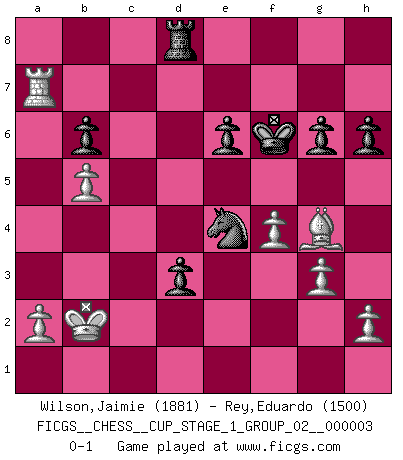 Last move : 0-1 2020 February 13 1:54:46 [Event "FICGS__CHESS__CUP_STAGE_1_GROUP_02__000003"] [Site "FICGS"] [Date "2019.11.02"] [Round "1"] [White "Wilson,Jaimie"] [Black "Rey,Eduardo"] [Result "0-1"] [WhiteElo "1881"] [BlackElo "1500"] 1.c4 c5 2.Nf3 Nf6 3.Nc3 Nc6 4.d4 cxd4 5.Nxd4 g6 6.e4 Bg7 7.Be3 O-O 8.Be2 d6 9.O-O Bd7 10.f3 Nxd4 11.Bxd4 a5 12.b3 Bc6 13.Qd2 Nd7 14.Be3 Nc5 15.Rab1 f5 16.exf5 Rxf5 17.Nb5 Bxb5 18.cxb5 e6 19.Rfd1 Rd5 20.Qe1 Rxd1 21.Rxd1 Qe7 22.Qf2 b6 23.Bd4 Bxd4 24.Qxd4 d5 25.Re1 Qg7 26.Qxg7+ Kxg7 27.f4 Kf6 28.g3 Rd8 29.Kf2 Rc8 30.Ke3 a4 31.bxa4 Nxa4 32.Kd2 Nc5 33.Kc2 Kf5 34.Kb2 Ra8 35.Bf1 h6 36.Bh3+ Kf6 37.Re3 d4 38.Ra3 Rd8 39.Ra7 d3 40.Bg4 Ne4 0-1 English : Symmetrical variation Kingside Castling by player Black (move 7) Kingside Castling by player White (move 9) Player Black won this chess game. Follow this game move after move (download)Bobby is the finest Chess player this country ever produced. His memory for the moves, his brilliance in dreaming up combinations, and his fierce determination to win are uncanny. (John Collins) Schach sollte überall auf der Welt Schulfach werden. Es fördert die geistige Auseinandersetzung. Es lehrt die Demut in der Niederlage. (Garry Kasparov) Todos los jugadores de Ajedrez deberían tener un pasatiempo. (Savielly Tartakower) Les Echecs mettent en conflit, non pas deux intelligences, mais deux volontés. (Lasker) If computers get too powerful, we can organize them into committees. That'll do them in. (Anonymous)
