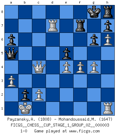 Last move : 1-0 2020 January 28 19:4:4 [Event "FICGS__CHESS__CUP_STAGE_1_GROUP_02__000003"] [Site "FICGS"] [Date "2019.11.02"] [Round "1"] [White "Payzansky,Aleksey"] [Black "Mohandoussaid,Malik"] [Result "1-0"] [WhiteElo "1808"] [BlackElo "1647"] 1.e4 c5 2.Nf3 Nc6 3.d4 cxd4 4.Nxd4 d6 5.Nc3 a6 6.f3 Nf6 7.Be3 g6 8.Qd2 Bg7 9.Be2 O-O 10.g4 Nxd4 11.Bxd4 b5 12.h4 Bb7 13.O-O-O Qa5 14.a3 Nd7 15.Bxg7 Kxg7 16.h5 Rh8 17.f4 e5 18.h6+ Kg8 19.Qxd6 b4 20.Qxd7 bxc3 21.Qxb7 cxb2+ 22.Kb1 Re8 23.Bc4 Rf8 24.Bxf7+ Rxf7 25.Qc8+ Rf8 26.Qc4+ Rf7 27.Rd7 1-0 Sicilian defense Kingside Castling by player Black (move 9) Queenside Castling by player White (move 13) Player White won this chess game. Follow this game move after move (download)The most powerful weapon in Chess is to have the next move. (David Bronstein) Ich organisiere ein großes Turnier, was mich etwa 120000 Dollar kostet. Ich denke, das ist das erste Mal in der Schachgeschichte, daß ein Schachgroßmeister auch als Mäzen auftritt. (Miguel Najdorf) EL Ajedrez es como la vida. (Boris Spassky) Les échecs sont un jeu terrible. Si vous n'avez pas le centre, votre adversaire a une position plus libre. Par contre, si vous avez le centre, alors vous avez vraiment quelque chose pour laquelle vous inquiéter ! (Siegbert Tarrasch) . 'gn is not allowed in chess unless n is an integer between 1 and 8 inclusive, where 1 and 8 are to interpreted as the standard numerals standing for integers in the ordered real-closed field R, with the *canonical* ordering. (As opposed to, say, an integer in the domain Z[2+i*sqrt(5)] or an integer in some exotic Grothendieck topos). (Normajean Yates)
