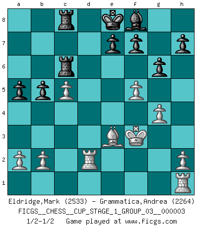 Last move : 1/2-1/2 2019 December 7 17:10:17 [Event "FICGS__CHESS__CUP_STAGE_1_GROUP_03__000003"] [Site "FICGS"] [Date "2019.11.02"] [Round "1"] [White "Eldridge,Mark"] [Black "Grammatica,Andrea"] [Result "1/2-1/2"] [WhiteElo "2533"] [BlackElo "2264"] 1.Nf3 Nf6 2.d4 g6 3.c4 Bg7 4.Nc3 d5 5.Qb3 dxc4 6.Qxc4 O-O 7.e4 a6 8.Be2 b5 9.Qb3 c5 10.dxc5 Bb7 11.e5 Nfd7 12.Be3 Nxe5 13.Nxe5 Bxe5 14.Rd1 Qc7 15.Nd5 Bxd5 16.Qxd5 Nc6 17.Bf3 Rac8 18.Qxc6 Qxc6 19.Bxc6 Rxc6 20.Rd2 Rfc8 21.f4 Bg7 22.Ke2 Kf8 23.g4 Ke8 24.f5 a5 25.Kf3 Bf8 1/2-1/2 Reti Opening Kingside Castling by player Black (move 6) This chess game ended in a draw. Follow this game move after move (download)Fischer Chess play was always razor-sharp, rational and brilliant. One of the best ever. (Dave Regis) Mit Schach schule ich mein Gefühl für Geometrie, was für Tennis und Schach gleichermaßen wichtig ist. (Boris Becker) En posiciones complicadas, Bobby Fischer pocas veces tuvo que temer de cualquiera. (Paul Keres) Les échecs sont utiles à l'exercice de la faculté de penser et à celle de l'imagination. Car nous devons posséder une méthode élaborée pour atteindre des buts partout où nous devons conduire notre raison. (Leibnitz) The project of the man are lower than those of the sky. (Chinese proverb)