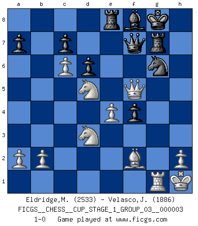 Last move : 1-0 2019 December 31 13:33:25 [Event "FICGS__CHESS__CUP_STAGE_1_GROUP_03__000003"] [Site "FICGS"] [Date "2019.11.02"] [Round "1"] [White "Eldridge,Mark"] [Black "Velasco,Jose Maria"] [Result "1-0"] [WhiteElo "2533"] [BlackElo "1886"] 1.Nf3 d6 2.d4 Nf6 3.c4 g6 4.Nc3 Bg7 5.e4 O-O 6.Be2 e5 7.O-O Nc6 8.d5 Ne7 9.Ne1 Nd7 10.f3 f5 11.Be3 f4 12.Bf2 g5 13.Nd3 Ng6 14.c5 Nf6 15.Rc1 Rf7 16.Kh1 Bf8 17.Rg1 h5 18.g3 g4 19.gxf4 exf4 20.fxg4 Nxg4 21.Bxg4 hxg4 22.Rxg4 Bxg4 23.Qxg4 Qf6 24.c6 bxc6 25.dxc6 Re8 26.Rg1 Rg7 27.Nd5 Qf7 28.Qf5 1-0 Reti Opening Kingside Castling by player Black (move 5) Kingside Castling by player White (move 7) Player White won this chess game. Follow this game move after move (download)He who fears an isolated Queen's Pawn should give up Chess. (Siegbert Tarrasch) Wie, soll nun auch die Opposition abgeschafft werden? Ja, es tut mir leid, Ihnen diesen Schmerz nicht ersparen zu können. (Aaron Nimzowitsch) El Ajedrez no es una pizca de inferior al violín, y tenemos un gran número de violinistas profesionales. (Mikhail Botvinnik) Des idées, des idées, j'en ai cent, j'en ai mille. Des bonnes, des mauvaises, applicables, irréalisables... Il suffit de faire le tri ! (Roos) Either move or be moved. (Ezra Pound)