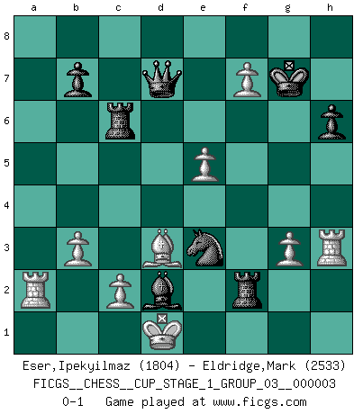 Last move : 0-1 2019 December 19 20:1:10 [Event "FICGS__CHESS__CUP_STAGE_1_GROUP_03__000003"] [Site "FICGS"] [Date "2019.11.02"] [Round "1"] [White "Eser,Ipekyilmaz"] [Black "Eldridge,Mark"] [Result "0-1"] [WhiteElo "1804"] [BlackElo "2533"] 1.a3 e5 2.d3 d5 3.g3 c5 4.Bg2 Nc6 5.h3 Be6 6.h4 Nf6 7.Nh3 h6 8.e3 Bd6 9.e4 dxe4 10.dxe4 O-O 11.h5 Re8 12.Be3 Qb6 13.b3 Rad8 14.Nd2 Qc7 15.Qe2 Nd4 16.Bxd4 cxd4 17.Ra2 Bxa3 18.Qd3 Bb4 19.f3 Rd6 20.f4 Bxh3 21.Rxh3 Rc6 22.fxe5 Ng4 23.e6 R8xe6 24.Qxd4 Bc3 25.Qxa7 Qd7 26.Qb8+ Kh7 27.Qf4 Rf6 28.Bf1 Rxf4 29.Bd3 Rf2 30.e5 g6 31.hxg6+ Kg7 32.Kd1 Bxd2 33.gxf7 Ne3+ 0-1 Anderssen's Opening Kingside Castling by player Black (move 10) Player Black won this chess game. Follow this game move after move (download)If a ruler does not understand Chess, how can he rule over a kingdom ? (King Khusros II) Pläne sind die Träume des Verständigen. (Ernst Freiherr von Feuchtersleben) Yo creo que el Ajedrez posee una magia que es también una ayuda en la edad avanzada. Una rodilla reumática es olvidada durante una partida de Ajedrez y otros eventos pueden parecer algo sin importancia comparada a una catástrofe en el tablero de Ajedrez. (Vlastimil Hort) D'abord les bases : Jouez et étudiez, puis étudiez et jouez, ensuite jouez et étudiez, puis étudiez et jouez. Deuxièmement : Donnez toujours le meilleur de vous-même ! (Ken Smith) Don't anthropomorphize computers - they hate it. (Anonymous)