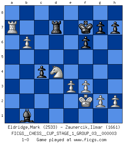 Last move : 1-0 2019 December 5 8:56:26 [Event "FICGS__CHESS__CUP_STAGE_1_GROUP_03__000003"] [Site "FICGS"] [Date "2019.11.02"] [Round "1"] [White "Eldridge,Mark"] [Black "Zaunercik,Ilmar"] [Result "1-0"] [WhiteElo "2533"] [BlackElo "1661"] 1.Nf3 d5 2.d4 Bf5 3.c4 e6 4.Nc3 Bb4 5.cxd5 exd5 6.Qb3 Nc6 7.Bg5 f6 8.Bd2 Bxc3 9.Bxc3 b6 10.Rc1 Qd7 11.e3 Nge7 12.Ba6 O-O 13.O-O Be4 14.Nd2 Bf5 15.Rfd1 Rfe8 16.Nf1 Kh8 17.Ng3 Bg6 18.Qa4 Rad8 19.Bf1 Ne5 20.Qxd7 Nxd7 21.Bb4 c5 22.dxc5 bxc5 23.Bxc5 Nxc5 24.Rxc5 Rc8 25.Ra5 Rc7 26.Ne2 Bc2 27.Rc1 Rec8 28.Nd4 Be4 29.Rxc7 Rxc7 30.f3 Bb1 31.Kf2 Kg8 32.b4 Nc8 33.a4 Nb6 34.Ra6 Nc8 35.b5 Nb6 36.a5 Nc4 37.Bxc4 dxc4 38.b6 axb6 39.Ra8+ Kf7 40.axb6 Rd7 41.Ra7 1-0 Reti Opening Kingside Castling by player Black (move 12) Kingside Castling by player White (move 13) Player White won this chess game. Follow this game move after move (download)I believe that Chess possesses a magic that is also a help in advanced age. A rheumatic knee is forgotten during a game of Chess and other events can seem quite unimportant in comparison with a catastrophe on the chessboard. (Vlastimil Hort) Je mehr wir mit Computern analysieren, desto mehr glauben wir an Verteidigung. (Vladimir Kramnik) Bobby es el jugador de Ajedrez mas fino que este país jamás haya producido. Su memoria para las movidas, su brillantez en soñar combinaciones y su feróz determinación por la victoria son algo extraño. (John Collins) Les Echecs sont et restent toujours un combat, un combat intégral comme la boxe, la lutte ou un autre sport, et où il doit y avoir un vainqueur et un vaincu. (Joseph Emil Diemer) Think like a man of action, act like a man of thought. (Henri Louis Bergson)
