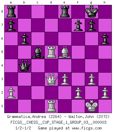 Last move : 1/2-1/2 2019 November 27 13:23:31 [Event "FICGS__CHESS__CUP_STAGE_1_GROUP_03__000003"] [Site "FICGS"] [Date "2019.11.02"] [Round "1"] [White "Grammatica,Andrea"] [Black "Walton,John"] [Result "1/2-1/2"] [WhiteElo "2264"] [BlackElo "2072"] 1.d4 Nf6 2.c4 e6 3.Nf3 b6 4.g3 Ba6 5.Qc2 c5 6.d5 exd5 7.cxd5 Bb7 8.Bg2 Nxd5 9.O-O Nc6 10.Rd1 Be7 11.Qa4 Nf6 12.Nh4 O-O 13.Nf5 d5 14.Nc3 Nd4 15.Nxd4 cxd4 16.Qxd4 Bc5 17.Qa4 Qc8 18.Nxd5 Nxd5 19.Bxd5 Bxd5 20.Rxd5 Qe6 21.Qd1 Qf6 22.Bf4 Qxb2 23.Be5 Qb4 24.Qd3 Rfe8 25.Rd1 h6 26.e3 1/2-1/2 Queen's Indian : Nimzovich variation (exaggerated Fianchetto) Kingside Castling by player White (move 9) Kingside Castling by player Black (move 12) This chess game ended in a draw. Follow this game move after move (download)Fischer was a master of clarity and a king of artful positioning. His opponents would see where he was going but were powerless to stop him. (Bruce Pandolfini) Jeder Fehler erscheint unglaublich dumm, wenn andre ihn begehen. (Georg Christoph Lichtenberg) El Ajedrez es el arte del análisis. (Mikhail Botvinnik) Toutes choses étant égales, c'est la conviction qui gagne. Alliée à une volonté de vaincre, elle sert de détonateur, suscite des idées, disperse les doutes et aide à penser clairement. (Robert Fischer) Information on the Internet is subject to the same rules and regulations as conversation at a bar. (George Lundberg)