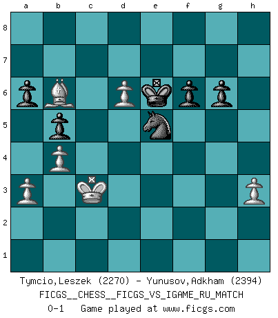 Last move : 0-1 2008 February 4 11:40:28 [Event "FICGS__CHESS__FICGS_VS_IGAME_RU_MATCH"] [Site "FICGS"] [Date "2007.06.27"] [Round "1"] [White "Tymcio,Leszek"] [Black "Yunusov,Adkham"] [Result "0-1"] [WhiteElo "2270"] [BlackElo "2394"] 1.e4 e5 2.Nf3 Nc6 3.Bb5 Nf6 4.O-O Nxe4 5.d4 Nd6 6.Bxc6 dxc6 7.dxe5 Nf5 8.Qxd8+ Kxd8 9.Nc3 Ne7 10.h3 h6 11.Be3 Ng6 12.Rad1+ Ke8 13.a3 Be7 14.Rfe1 Bd7 15.Re2 Rd8 16.Nd4 c5 17.Nb3 b6 18.Nd5 Bc6 19.Nxc7+ Kf8 20.Rxd8+ Bxd8 21.Nd5 Bxd5 22.Rd2 Ne7 23.c4 Bc7 24.cxd5 Bxe5 25.f4 Bd6 26.Kf2 h5 27.Rd1 Ke8 28.Nd2 Kd7 29.Ne4 Nf5 30.Kf3 Nh4+ 31.Kf2 Re8 32.Nxd6 Kxd6 33.g4 Re4 34.Rg1 f6 35.Rd1 a6 36.b3 b5 37.b4 c4 38.Bc5+ Kd7 39.gxh5 Rxf4+ 40.Kg3 Re4 41.Rf1 c3 42.Rf2 Ke8 43.Bb6 Ke7 44.Bc5+ Kf7 45.Bb6 g6 46.Rc2 Rc4 47.h6 Nf5+ 48.Kf3 Nxh6 49.Ke2 Nf5 50.Kd3 Ne7 51.d6 Nc6 52.Rxc3 Ne5+ 53.Kd2 Rxc3 54.Kxc3 Ke6 0-1 Ruy Lopez : Berlin defense, Open variation Kingside Castling by player White (move 4) Player Black won this chess game. Follow this game move after move (download)Some sacrifices are sound; the rest are mine. (Mikhail Tal) Man gibt nur Pakete auf. (Paul Keres) El poder defensivo de una pieza clavada, solamente es imaginario. (Aaron Nimzovich) Les ravages du H expliquent la différence de niveau entre Tal et Thal [Abergel]. Difficult things take a long time, impossible things a little longer. (Author unknown)