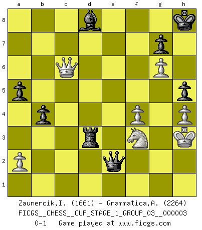 Last move : 0-1 2019 December 4 20:4:45 [Event "FICGS__CHESS__CUP_STAGE_1_GROUP_03__000003"] [Site "FICGS"] [Date "2019.11.02"] [Round "1"] [White "Zaunercik,Ilmar"] [Black "Grammatica,Andrea"] [Result "0-1"] [WhiteElo "1661"] [BlackElo "2264"] 1.e4 e5 2.Nf3 Nc6 3.Bb5 a6 4.Ba4 Nf6 5.O-O Be7 6.Re1 b5 7.Bb3 O-O 8.c3 d5 9.exd5 Nxd5 10.d3 Bg4 11.h3 Bh5 12.Nbd2 Nf4 13.d4 exd4 14.Ne4 Bxf3 15.Qxf3 Ng6 16.Ng3 Nce5 17.Qh5 dxc3 18.Rxe5 Nxe5 19.Qxe5 Bf6 20.Qe2 Re8 21.Qh5 Re1+ 22.Kh2 cxb2 23.Bxf7+ Kh8 24.Bg6 Qg8 25.Bxb2 Rxa1 26.Bxa1 Bxa1 27.Ne4 Bf6 28.Nc5 h6 29.Bf7 Qd8 30.Ne6 Qe7 31.g3 Be5 32.h4 c6 33.Kg2 a5 34.g4 Bc3 35.g5 Ra7 36.g6 b4 37.Ng5 Bf6 38.f4 Rd7 39.Qg4 Rd2+ 40.Kh3 Qe1 41.Bd5 Rxd5 42.Nf7+ Kg8 43.Ne5 Qe3+ 44.Nf3 Rd3 45.Qc8+ Bd8 46.Qxc6 h5 47.Qc4+ Kh8 48.Qc6 Qe2 0-1 Ruy Lopez : Closed, 7...O-O Kingside Castling by player White (move 5) Kingside Castling by player Black (move 7) Player Black won this chess game. Follow this game move after move (download)Chess is 99 percent tactics. (Teichmann) Nie in meinem Leben habe ich die französische Verteidigung gespielt, welche die Stumpfsinnigste von allen ist. (Wilhelm Steinitz) Evita las multitudes. Haz independientemente tu propio razonamiento. Trata de ser el jugador de Ajedrez, no la pieza de Ajedrez. (Ralph Charell) Je menace de comprendre la position. (Anonyme) Excelling at chess has long been considered a symbol of more general intelligence. That is an incorrect assumption in my view, as pleasant as it might be. But for the purposes of argument and investigation, chess is, in Russkin-Gutman's words, 'an unparalleled laboratory, since both the learning process and the degree of ability obtained can be objectified and quantified, providing an excellent comparative framework on which to use rigorous analytical techniques.' (The Chess Master and the Computer, by Garry Kasparov - 2010)