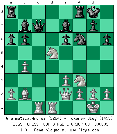 Last move : 1-0 2019 December 17 18:25:11 [Event "FICGS__CHESS__CUP_STAGE_1_GROUP_03__000003"] [Site "FICGS"] [Date "2019.11.02"] [Round "1"] [White "Grammatica,Andrea"] [Black "Tokarev,Oleg"] [Result "1-0"] [WhiteElo "2264"] [BlackElo "1499"] 1.d4 d5 2.c4 c6 3.Nf3 Nf6 4.e3 e6 5.b3 Be7 6.Bb2 b6 7.Bd3 Nbd7 8.O-O Bb7 9.Nc3 O-O 10.Qe2 a6 11.Rfd1 c5 12.cxd5 exd5 13.Rac1 h6 14.dxc5 Nxc5 15.Bf5 Qc7 16.b4 Ne6 17.Bxe6 fxe6 18.Nxd5 1-0 QGD Slav : 4.e3 Kingside Castling by player White (move 8) Kingside Castling by player Black (move 9) Player White won this chess game. Follow this game move after move (download)Chess is the art which expresses the science of logic. (Mikhail Botvinnik) Alles was ich jemals tun will ist Schach spielen. (Robert James Fischer) No existe un remordimiento como el remordimiento del Ajedrez. (H. G. Wells) Aucun coup ne doit être joué sans but. (Pedro Damiano) Unless in communicating with it one says exactly what one means, trouble is bound to result. (Alan Turing, about computers)