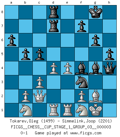 Last move : 0-1 2020 January 6 10:39:44 [Event "FICGS__CHESS__CUP_STAGE_1_GROUP_03__000003"] [Site "FICGS"] [Date "2019.11.02"] [Round "1"] [White "Tokarev,Oleg"] [Black "Simmelink,Joop"] [Result "0-1"] [WhiteElo "1499"] [BlackElo "2201"] 1.e4 c5 2.Nf3 d6 3.c3 Nf6 4.d3 g6 5.Be2 Bg7 6.O-O O-O 7.h3 Nc6 8.Be3 e5 9.Nbd2 Nh5 10.Nh2 Nf4 11.Bxf4 exf4 12.Bf3 h5 13.Re1 Qg5 14.Kh1 Rb8 15.Nc4 Be6 16.Nxd6 Rfd8 17.Nb5 Rd7 18.Qc2 a6 19.Na3 Rbd8 20.Rad1 Ne5 21.Be2 Qh4 22.Bf1 b5 23.Nb1 Bxa2 24.Rd2 f3 25.gxf3 Bh6 26.R2d1 Be6 27.Bg2 Bxh3 28.d4 Bf4 29.Nf1 Bg4 30.Kg1 Nxf3+ 0-1 This chess game has been lost on time (started : 2019.11.02 13:52:24) Sicilian Kingside Castling by player White (move 6) Kingside Castling by player Black (move 6) Player Black won this chess game. Follow this game move after move (download)War is the child of passion, passion is the child of narcissism and narcissism is the child. (...) Another game ? (Thibault de Vassal) Ich habe die besten Aussichten, den ersten Preis zu gewinnen - denn jeder muss gegen Steinitz spielen, nur ich nicht! (Wilhelm Steinitz) No soy una persona materialista y por eso, no resiento la falta o pérdida del dinero. La ausencia de cosas mundanas carece de importancia. Ya que el Ajedrez es una forma en la que puedo ser tan materialista como yo desee sin tener la necesidad de vender mi alma. (Jamie Walter Adams) Les échecs sont utiles à l'exercice de la faculté de penser et à celle de l'imagination. Car nous devons posséder une méthode élaborée pour atteindre des buts partout où nous devons conduire notre raison. (Leibnitz) The arrogant army will lose certainly the battle. (Chinese proverb)