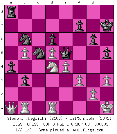 Last move : 1/2-1/2 2019 November 27 13:53:30 [Event "FICGS__CHESS__CUP_STAGE_1_GROUP_03__000003"] [Site "FICGS"] [Date "2019.11.02"] [Round "1"] [White "Slawomir,Weglicki"] [Black "Walton,John"] [Result "1/2-1/2"] [WhiteElo "2100"] [BlackElo "2072"] 1.d4 Nf6 2.c4 c5 3.d5 e6 4.Nc3 exd5 5.cxd5 d6 6.Nf3 g6 7.e4 Bg7 8.Be2 O-O 9.Nd2 Re8 10.O-O Na6 11.f3 Nc7 12.a4 b6 13.Nc4 Ba6 14.Bg5 h6 15.Be3 Bxc4 16.Bxc4 a6 17.Qd2 Kh7 18.Rab1 Rb8 19.b4 b5 20.Ba2 cxb4 21.Rxb4 Nd7 22.Rc1 a5 23.R4b1 b4 24.Ne2 Na6 25.Bc4 Nac5 26.Bb5 Rxb5 27.axb5 b3 28.Bd4 a4 29.Bxg7 Kxg7 30.Rd1 Qf6 31.Qa5 Qd8 32.Qc3+ Qf6 33.Nd4 Ra8 34.Qa1 Nb6 35.h3 h5 36.Kh2 Qe5+ 37.Kh1 Kh7 38.Qa3 Qg5 39.Qa1 Qe5 1/2-1/2 Benoni defense Kingside Castling by player Black (move 8) Kingside Castling by player White (move 10) This chess game ended in a draw. Follow this game move after move (download)Chess is imagination. (David Bronstein) Fischer: 'Remis!?' Uhlmann: 'Aber es muss doch dreimal Zugwiederholung sein!' Fischer: 'Sie nehmen das Remis an, wie ich es sage, sonst spiele ich weiter und werde Sie dann schlagen!' (Robert James Fischer) Uno por uno, yo los acribillé, mi superioridad muy pronto se volvio aparente. (Jose Capablanca) Avant la finale, les dieux ont créé le milieu de partie. (Tarrasch) Train yourself to let go of everything you fear to lose. (Master Yoda in Star Wars ep.3)