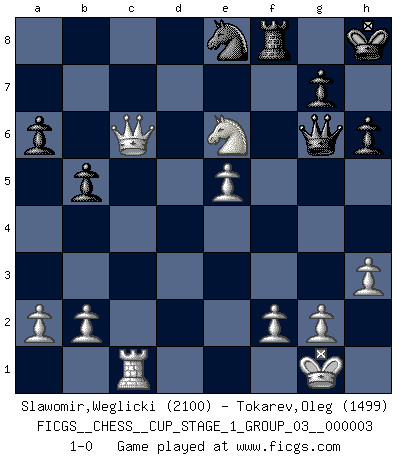 Last move : 1-0 2020 January 3 5:59:27 [Event "FICGS__CHESS__CUP_STAGE_1_GROUP_03__000003"] [Site "FICGS"] [Date "2019.11.02"] [Round "1"] [White "Slawomir,Weglicki"] [Black "Tokarev,Oleg"] [Result "1-0"] [WhiteElo "2100"] [BlackElo "1499"] 1.d4 d5 2.c4 c6 3.Nf3 Nf6 4.Nc3 e6 5.Bg5 Be7 6.e3 O-O 7.Qc2 Nbd7 8.cxd5 exd5 9.Bd3 h6 10.Bh4 b6 11.O-O Bb7 12.Rfe1 c5 13.Rad1 a6 14.dxc5 Nxc5 15.e4 d4 16.Bc4 b5 17.Rxd4 Qc7 18.e5 Ne8 19.Nd5 Bxd5 20.Bxd5 Rd8 21.Bxe7 Qxe7 22.Rc1 Ne6 23.Bxe6 fxe6 24.Qc6 Rxd4 25.Nxd4 Qh4 26.Nf3 Qg4 27.h3 Qg6 28.Nd4 Kh8 29.Nxe6 1-0 This chess game has been lost on time (started : 2019.11.02 13:52:24) QGD Slav : 4.Nc3 Kingside Castling by player Black (move 6) Kingside Castling by player White (move 11) Player White won this chess game. Follow this game move after move (download)In Fischer's hands, a slight theoretical advantage is as good a being a Queen ahead. (Isaac Kashdan) Modernes Schach sorgt sich zuviel um Dinge wie Bauernstruktur usw. Vergessen Sie das, Schachmatt beendet das Spiel! (Nigel Short) El Ajedrez es el arte del análisis. (Mikhail Botvinnik) Il vaut toujours mieux jouer un plan faux de façon logique que de n'avoir pas de plan du tout. (Victor Kortchnoï) Humor is by far the most significant activity of the human brain. (Edward De Bono)