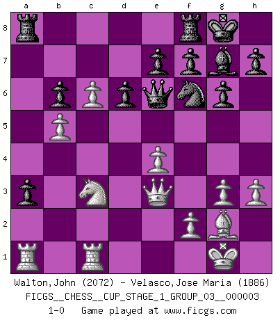 Last move : 1-0 2019 December 21 23:0:44 [Event "FICGS__CHESS__CUP_STAGE_1_GROUP_03__000003"] [Site "FICGS"] [Date "2019.11.02"] [Round "1"] [White "Walton,John"] [Black "Velasco,Jose Maria"] [Result "1-0"] [WhiteElo "2072"] [BlackElo "1886"] 1.d4 d6 2.c4 Nf6 3.Nc3 g6 4.g3 Bg7 5.Bg2 O-O 6.Nf3 Nc6 7.O-O a6 8.h3 Rb8 9.e4 b5 10.d5 Na5 11.cxb5 axb5 12.b4 Nc4 13.Nd4 Bd7 14.a4 bxa4 15.b5 Nb6 16.Qd3 Ra8 17.Be3 Qc8 18.Nc6 Bxc6 19.dxc6 a3 20.Rfc1 Qe6 21.Bxb6 cxb6 22.Qe3 1-0 Old Indian defense Kingside Castling by player Black (move 5) Kingside Castling by player White (move 7) Player White won this chess game. Follow this game move after move (download)Some part of a mistake is always correct. (Savielly Tartakover) Schach ist Kampf, hauptsächlich jedoch gegen die eigenen Fehler. (Savielly Grigorievitsch Tartakower) El jugador táctico sabe que hacer cuando hay algo que hacer; mientras que el estratega sabe que hacer cuando no hay nada que hacer. (Gerald Abrahams) 'L'échange des dames est un coup dur pour les deux adversaires...' Un journaliste lors d'une partie du match Spassky-Fischer May I never be complete. May I never be content. May I never be perfect. Deliver me, Tyler, from being perfect and complete. (Chuck Palahniuk, Fight Club)