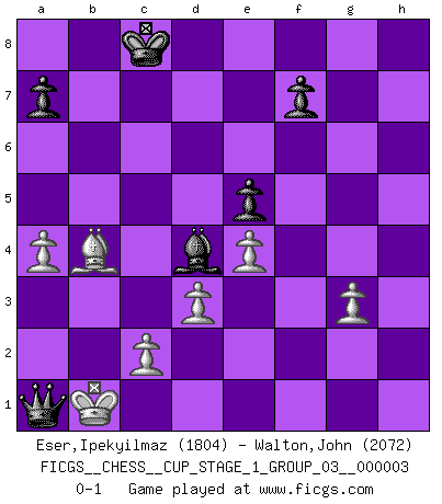 Last move : 0-1 2020 January 14 16:58:50 [Event "FICGS__CHESS__CUP_STAGE_1_GROUP_03__000003"] [Site "FICGS"] [Date "2019.11.02"] [Round "1"] [White "Eser,Ipekyilmaz"] [Black "Walton,John"] [Result "0-1"] [WhiteElo "1804"] [BlackElo "2072"] 1.a3 e5 2.d3 d5 3.g3 c5 4.Bg2 Nc6 5.h3 Be6 6.h4 Nf6 7.Nh3 h6 8.e3 Qd7 9.e4 O-O-O 10.f3 dxe4 11.fxe4 c4 12.Nf2 Bc5 13.Bf3 g5 14.hxg5 hxg5 15.Bxg5 Ng4 16.Nxg4 Rxh1+ 17.Bxh1 Bxg4 18.Bf3 Bxf3 19.Qxf3 Nd4 20.Qd1 Qh3 21.Bxd8 Qh1+ 22.Kd2 Nf3+ 23.Qxf3 Qxf3 24.Ba5 b5 25.a4 Qf2+ 26.Kd1 b4 27.Nd2 c3 28.bxc3 Be3 29.Kc1 Qxd2+ 30.Kb2 Qxc3+ 31.Kb1 Bd4 32.Bxb4 Qxa1+ 0-1 This chess game has been lost on time (started : 2019.11.02 13:52:24) Anderssen's Opening Queenside Castling by player Black (move 9) Player Black won this chess game. Follow this game move after move (download)If your opponent offers you a draw, try to work out why he thinks he's worse off. (Nigel Short) Es tut gut, die Entwicklungsperiode von, [...] demokratischem Geist durchdringen zu lassen. Wie undemokratisch wäre es doch beispielsweise, den einen Offizier große Spaziertouren vornehmen zu lassen, während die anderen zu Hause säßen und sich entsetzlich langweilten. (Aaron Nimzowitsch) Yo no creo en la psicología. Yo creo en las buenas movidas. (Bobby Fischer) J'ai toujours senti une vague pitié pour l'homme qui ne connaît rien aux échecs, tout comme j'en aurais pour un homme ignorant de l'amour. Les Echecs, comme la musique ou comme l'amour, ont le pouvoir de rendre heureux. (Siegbert Tarrasch) The leaves of memory seemed to make a mournful rustling in the dark. (Henry Wadsworth Longfellow)