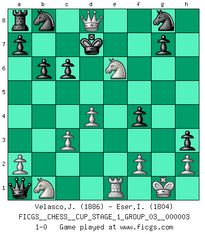 Last move : 1-0 2019 December 21 19:41:12 [Event "FICGS__CHESS__CUP_STAGE_1_GROUP_03__000003"] [Site "FICGS"] [Date "2019.11.02"] [Round "1"] [White "Velasco,Jose Maria"] [Black "Eser,Ipekyilmaz"] [Result "1-0"] [WhiteElo "1886"] [BlackElo "1804"] 1.d4 f6 2.e4 e6 3.Bd3 b6 4.Nf3 Bb7 5.O-O h6 6.Nh4 h5 7.Ng6 Rh7 8.e5 f5 9.Be2 h4 10.Bh5 d6 11.Nf4 Ke7 12.exd6+ Qxd6 13.Ng6+ Kd8 14.Bf4 Qb4 15.c3 Qxb2 16.Nxf8 Qxa1 17.Qe2 Bxg2 18.Kxg2 Rxh5 19.Qxh5 h3+ 20.Kg1 e5 21.Ne6+ Ke7 22.Qxf5 exf4 23.Re1 c6 24.Qf8+ Kd7 25.Qd8+ 1-0 Queen's pawn Kingside Castling by player White (move 5) Player White won this chess game. Follow this game move after move (download)In Chess, just as in life, today's bliss may be tomorrow's poison. (Assaic) Konzentriere dich auf materielle Gewinne. Nimm, was dir dein Gegner gibt, ausser es gibt einen guten Grund der dagegenspricht. (Robert James Fischer) Existen dos clases de sacrificios: los correctos y los míos. (Mikhail Tal) Vous savez, camarade Pachman, je n'éprouve pas de plaisir à être ministre, je jouerais plutôt aux échecs comme vous, ou alors ferais une révolution au Venezuela. (Che Guevara à Ludek Pachman, 'Checkmate in Prague', 1975) Art is the only way to run away without leaving home. (Twyla Tharp)