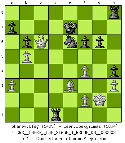 Last move : 0-1 2020 January 18 16:34:56 [Event "FICGS__CHESS__CUP_STAGE_1_GROUP_03__000003"] [Site "FICGS"] [Date "2019.11.02"] [Round "1"] [White "Tokarev,Oleg"] [Black "Eser,Ipekyilmaz"] [Result "0-1"] [WhiteElo "1499"] [BlackElo "1804"] 1.e4 f6 2.Nf3 e6 3.d4 b6 4.Bd3 Bb7 5.O-O h6 6.c4 h5 7.d5 h4 8.h3 c6 9.Nc3 Bb4 10.Ne2 Ne7 11.a3 Bd6 12.Be3 cxd5 13.exd5 exd5 14.b4 dxc4 15.Bxc4 Qc7 16.Rc1 Bc6 17.b5 Bxf3 18.Bf7+ Kxf7 19.Rxc7 Bxc7 20.gxf3 d6 21.Qb3+ d5 22.Nf4 Bxf4 23.Bxf4 Nd7 24.Re1 Nc5 25.Rxe7+ Kxe7 26.Qxd5 Rad8 27.Qc6 Ne6 28.Be3 Rd3 29.f4 Rd1+ 30.Kg2 g6 0-1 This chess game has been lost on time (started : 2019.11.02 13:52:24) Barnes defense Kingside Castling by player White (move 5) Player Black won this chess game. Follow this game move after move (download)Chess teaches you to control the initial excitement you feel when you see something that looks good and it trains you to think objectively when you're in trouble. (Stanley Kubrick) Ohne ihre Erfolge schmälern zu wollen würde ich sagen Petrosian, Spassky und Karpov verdanken ihre Siege ihren Trainern - Boleslavsky, Bondarevsky und Furman. (Mikhail Moiseyevich Botvinik) ¿Cual es el objetivo de jugar una apertura de gambito?... Para adquirir una reputación de ser un jugador apuesto a costo de perder el juego. (Siegbert Tarrasch) Aucun coup ne doit être joué sans but. (Pedro Damiano) A good aphorism is too hard for the tooth of time, and is not worn away with the centuries, although it serves as food for every speech. (Friedrich Nietzsche)