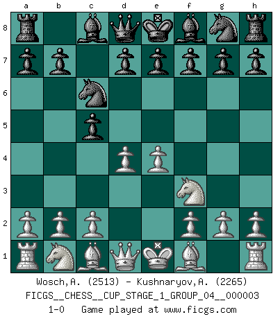 Last move : 1-0 2019 December 5 18:9:34 [Event "FICGS__CHESS__CUP_STAGE_1_GROUP_04__000003"] [Site "FICGS"] [Date "2019.11.02"] [Round "1"] [White "Wosch,Arkadiusz"] [Black "Kushnaryov,Andrey"] [Result "1-0"] [WhiteElo "2513"] [BlackElo "2265"] 1.e4 c5 2.Nf3 Nc6 3.d4 1-0 This chess game has been lost on time (started : 2019.11.02 13:52:26) Sicilian defense Player White won this chess game. Follow this game move after move (download)The only thing Chess players have in common is Chess. (Lodewijk Prins) Frage: Gibt es etwas was Sie mehr lieben als Autobahnen ohne Tempobegrenzungen? - Antwort: Deutsche Frauen ohne Tempobegrenzungen. (Loek van Wely) Uno por uno, yo los acribillé, mi superioridad muy pronto se volvio aparente. (Jose Capablanca) Les Echecs mettent en conflit, non pas deux intelligences, mais deux volontés. (Lasker) Political correctness is subjecting us to gross incompetence. (Johann Piek)