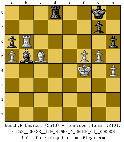 Last move : 1-0 2020 June 18 3:55:34 [Event "FICGS__CHESS__CUP_STAGE_1_GROUP_04__000003"] [Site "FICGS"] [Date "2019.11.02"] [Round "1"] [White "Wosch,Arkadiusz"] [Black "Tanriover,Taner"] [Result "1-0"] [WhiteElo "2513"] [BlackElo "2101"] 1.e4 e5 2.Nf3 Nc6 3.Bc4 Nf6 4.d3 Bc5 5.c3 O-O 6.O-O d5 7.exd5 Nxd5 8.Re1 Bb6 9.Nbd2 f6 10.d4 Kh8 11.dxe5 Nxe5 12.Nxe5 fxe5 13.Ne4 c6 14.Bg5 Qd7 15.Bh4 Qf7 16.a4 Nxc3 17.bxc3 Qxc4 18.Be7 Rf7 19.a5 Bc7 20.Nd6 Bxd6 21.Bxd6 Bd7 22.Bxe5 c5 23.h3 Kg8 24.Re3 Re8 25.f4 Bf5 26.Qh5 Bc2 27.Kh2 Bg6 28.Qg5 Qb5 29.R3e1 Qc6 30.Rad1 h6 31.Qh4 Re6 32.c4 Kh7 33.Rd8 Rd7 34.Rxd7 Qxd7 35.Qf2 Qf7 36.Qxc5 Re7 37.Rd1 Be4 38.Qd6 a6 39.c5 Bf5 40.c6 bxc6 41.Qxc6 Qa2 42.Rd8 Qe2 43.Qd6 Be4 44.Qd2 Qxd2 45.Rxd2 Bc6 46.Rd6 Bb5 47.g4 Rd7 48.Re6 Bc4 49.Rb6 Rd2+ 50.Kg3 Rd3+ 51.Kh4 Rd7 52.f5 Re7 53.Ba1 Bb5 54.Kg3 Re1 55.Bd4 Rd1 56.Be5 Re1 57.Kf4 Rf1+ 58.Ke4 Re1+ 59.Kd5 Rd1+ 60.Bd4 Rc1 61.h4 Rc8 62.Ke5 Rd8 63.Ke4 Re8+ 64.Kf4 Kg8 65.g5 Rd8 66.Bc5 1-0 Two knights defense (Modern Bishop's Opening) Kingside Castling by player Black (move 5) Kingside Castling by player White (move 6) Player White won this chess game. Follow this game move after move (download)The stomach is an essential part of the Chess master. (Bent Larsen) Ein Schachgenie ist jemand der verdammt gut Schach spielt. (Jonathan Levitt) No es suficiente ser un buen jugador, se debe también de jugar bién. (Siegbert Tarrasch) Demandez au pauvre Cg1 ce qu'il en pense. Eduard Gufeld à propos de la variante Saemisch de l'Est-Indienne. Chess is as much a mystery as women. (Purdy)