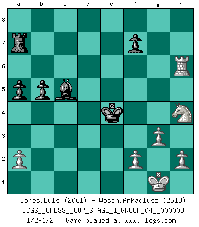Last move : 1/2-1/2 2020 March 16 17:12:58 [Event "FICGS__CHESS__CUP_STAGE_1_GROUP_04__000003"] [Site "FICGS"] [Date "2019.11.02"] [Round "1"] [White "Flores,Luis"] [Black "Wosch,Arkadiusz"] [Result "1/2-1/2"] [WhiteElo "2061"] [BlackElo "2513"] 1.d4 Nf6 2.c4 e6 3.Nf3 d5 4.Nc3 c6 5.e3 Nbd7 6.Bd3 dxc4 7.Bxc4 b5 8.Bd3 Bd6 9.O-O O-O 10.e4 e5 11.Ne2 Bb7 12.Bg5 Re8 13.Qc2 exd4 14.Nexd4 h6 15.Bh4 a6 16.Nf5 Bf4 17.g3 Bb8 18.b4 c5 19.bxc5 Nxc5 20.Bxf6 Qxd3 21.Qxd3 Nxd3 22.Nxg7 Rc8 23.Nf5 Kh7 24.Ne7 Rc2 25.Nd5 Nc5 26.Bd4 Nxe4 27.Nb6 Nc3 28.Bxc3 Ra7 29.Nh4 Rxc3 30.Nd7 Bd6 31.Rfe1 Bc6 32.Nf6+ Kg7 33.Ne4 Bxe4 34.Rxe4 Bc5 35.Rae1 Rc2 36.R1e2 Rxe2 37.Rxe2 Kf6 38.Re8 a5 39.Rh8 Ke5 40.Rxh6 Ke4 1/2-1/2 Queen's pawn game Kingside Castling by player White (move 9) Kingside Castling by player Black (move 9) This chess game ended in a draw. Follow this game move after move (download)Chess is a beautiful mistress. (Bent Larsen) Ein unbeabsichtigtes Patt ist der Gipfel der Dummheit. (Anonymous) Una buena memoria, concentración, imaginación y una fuerte voluntad, se requiere para llegar a ser un buen jugador. (Bobby Fischer) Les ravages du H expliquent la différence de niveau entre Tal et Thal [Abergel]. A woman without a man is like a fish without a bicycle. (Gloria Steinem)