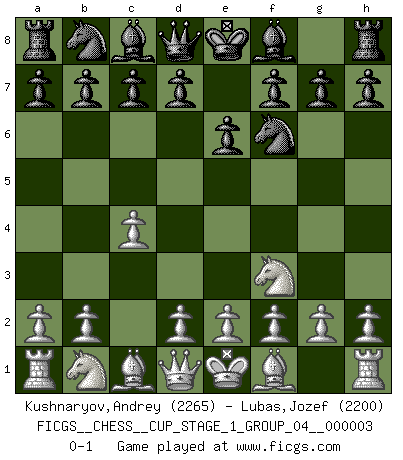 Last move : 0-1 2019 December 5 5:43:42 [Event "FICGS__CHESS__CUP_STAGE_1_GROUP_04__000003"] [Site "FICGS"] [Date "2019.11.02"] [Round "1"] [White "Kushnaryov,Andrey"] [Black "Lubas,Jozef"] [Result "0-1"] [WhiteElo "2265"] [BlackElo "2200"] 1.Nf3 Nf6 2.c4 e6 0-1 This chess game has been lost on time (started : 2019.11.02 13:52:26) Reti Opening Player Black won this chess game. Follow this game move after move (download)Chess is a sea in which a gnat may drink and an elephant may bathe. (Hindu proverb) Das Spiel gibt uns die Genugtuung, die das Leben uns versagt. (Emanuel Lasker) Te sientas frente a un tablero y repentinamente tu corazón brinca. Tu mano tiembla al tomar una pieza y moverla. Pero lo que el Ajedrez te enseña es que tu debes permanecer ahí con calma y pensar de que si realmente es una buena idea o de que si hay otras ideas mejores. (Stanley Kubrick) L'ordinateur a tué l'originalité. Il n'y a plus guère d'aventures sur l'échiquier. (Jacob Murray) The quality of decision is like the well-timed swoop of a falcon which enables it to strike and destroy its victim. (Sun Tzu)