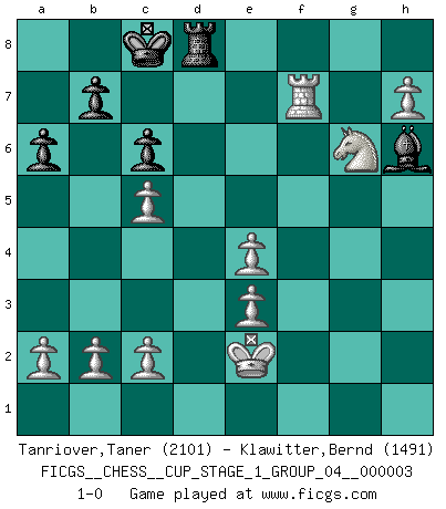 Last move : 1-0 2020 February 15 22:23:27 [Event "FICGS__CHESS__CUP_STAGE_1_GROUP_04__000003"] [Site "FICGS"] [Date "2019.11.02"] [Round "1"] [White "Tanriover,Taner"] [Black "Klawitter,Bernd"] [Result "1-0"] [WhiteElo "2101"] [BlackElo "1491"] 1.e4 c5 2.Nf3 Nc6 3.Bb5 a6 4.Bxc6 dxc6 5.d3 Bg4 6.h3 Bh5 7.Be3 e6 8.Nbd2 Be7 9.g4 Bg6 10.Ne5 f6 11.Nxg6 hxg6 12.g5 fxg5 13.Qg4 Kd7 14.Nc4 Nf6 15.Qxg5 Nd5 16.Qxg6 Nxe3 17.fxe3 Qc7 18.O-O-O Raf8 19.d4 Kc8 20.dxc5 Kb8 21.Qxg7 Rhg8 22.Qe5 Qxe5 23.Nxe5 Rd8 24.h4 Kc8 25.Rxd8+ Kxd8 26.h5 Bf6 27.Nc4 e5 28.h6 Rh8 29.h7 Kc7 30.Rf1 Bg5 31.Rf7+ Kb8 32.Kd2 Bh6 33.Nxe5 Rd8+ 34.Ke2 Kc8 35.Ng6 1-0 Sicilian : Nimzovich-Rossolimo attack (without ...d6) Queenside Castling by player White (move 18) Player White won this chess game. Follow this game move after move (download)The essence of Chess is thinking about what Chess is. (David Bronstein) Schach ist ein Kampf gegen den Fehler. (Johannes Herrman Zukertort) Bobby solo arroja las piezas y solas caen en las casillas correctas. (Miguel Najdorf ) Assurément je connaissais par expérience le mystérieux attrait de ce jeu royal, le seul entre tous les jeux inventés par les hommes qui échappe souverainement à la tyrannie du hasard, le seul où l'on ne doive sa victoire qu'à son intelligence ou plutôt à une certaine forme d'intelligence. Mais n'est-ce pas déjà le limiter injurieusement que d'appeler les échecs un jeu ? N'est-ce pas une science, un art ou quelque chose qui, comme le cercueil de Mahomet entre ciel et terre, est suspendu entre l'un et l'autre, et qui réunit un nombre incroyable de contraires ? [...] C'est une pensée qui ne mène à rien, une mathématique qui n'établit rien, un art qui ne laisse pas d'uvre, une architecture sans matière; et il l'a prouvé néanmoins qu'il était plus durable, à sa manière, que les livres ou que tout autre monument, ce jeu unique qui appartient à tous les peuples et à tous les temps, et dont personne ne sait quel dieu en fit don à la terre pour tuer l'ennui, pour aiguiser l'esprit et stimuler l'âme. Où commence-t-il, où finit-il ? (Stefan Zweig) Men should grow up. - Yeah. And dogs should stop licking themselves. It's not gonna happen. (Gregory House to Dr. Cameron, House M.D.)