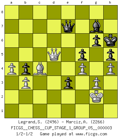 Last move : 1/2-1/2 2020 March 18 11:59:33 [Event "FICGS__CHESS__CUP_STAGE_1_GROUP_05__000003"] [Site "FICGS"] [Date "2019.11.02"] [Round "1"] [White "Legrand,Stephane"] [Black "Marciz,Alexander"] [Result "1/2-1/2"] [WhiteElo "2496"] [BlackElo "2266"] 1.e4 c5 2.Nf3 Nc6 3.d4 cxd4 4.Nxd4 Nf6 5.Nc3 e5 6.Ndb5 d6 7.Bg5 a6 8.Na3 b5 9.Nd5 Be7 10.Bxf6 Bxf6 11.c3 Bg5 12.Nc2 Rb8 13.a3 Ne7 14.Ncb4 Nxd5 15.Nxd5 O-O 16.h4 Be7 17.g3 Be6 18.Bh3 Rc8 19.Rc1 a5 20.Rc2 Rc4 21.Qd3 Bxd5 22.Qxd5 Rc5 23.Qd3 d5 24.O-O dxe4 25.Qxe4 Qa8 26.Qe2 e4 27.Rd1 Re5 28.f4 Rd5 29.Rxd5 Qxd5 30.Rd2 Qc5+ 31.Kh2 b4 32.cxb4 axb4 33.a4 e3 34.Rd3 Bf6 35.b3 Re8 36.Bd7 Re4 37.Bg4 g6 38.Rd7 h6 39.Qg2 Rd4 40.Rxd4 Bxd4 41.Be2 Kg7 42.Qe4 h5 43.Bc4 f5 44.Qf3 Bc3 45.Qd1 Bd2 46.Kh3 Kh7 47.Qe2 Bc3 48.Qd3 Bd4 49.Qd1 Bc3 50.Qf3 Kh6 51.Qd1 Bd2 52.Qa1 Bc3 53.Qd1 Bh8 54.Kh2 Qc7 55.Qf3 Qc5 56.Qd1 Bg7 57.Kg2 Qb6 58.Qf3 Qa7 59.Qd5 Qe7 60.Be2 Qc7 61.Bc4 Qe7 62.Be2 Qc7 63.Bc4 Qe7 1/2-1/2 Sicilian : Pelikan (Lasker/Sveshnikov) variation Kingside Castling by player Black (move 15) Kingside Castling by player White (move 24) This chess game ended in a draw. Follow this game move after move (download)By playing at Chess then, we may learn: First: Foresight... Second: Circumspection... Third: Caution... And lastly, we learn by Chess the habit of not being discouraged by present bad appearances in the state of our affairs, the habit of hoping for a favorable chance, and that of persevering in the secrets of resources. (Benjamin Franklin) Schach ist die gewalttätigste aller Sportarten. (Garry Kasparov) Dejen al perfeccionista jugar por correo. (Yasser Seirawan) Fischer est le meilleur joueur du monde et Karpov n'est qu'un joueur de bistrot. (Garry Kasparov, agé de 16 ans) Are you threatening me, Master Jedi ? (Chancellor Palpatine in Star Wars ep.3)