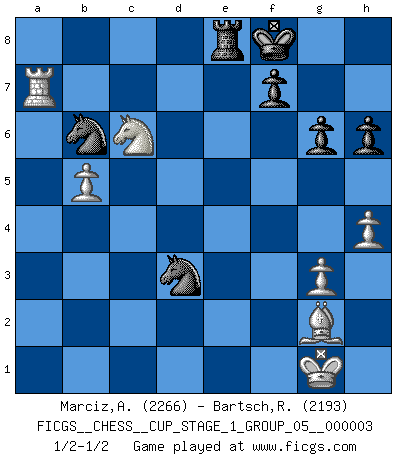 Last move : 1/2-1/2 2020 January 3 18:33:11 [Event "FICGS__CHESS__CUP_STAGE_1_GROUP_05__000003"] [Site "FICGS"] [Date "2019.11.02"] [Round "1"] [White "Marciz,Alexander"] [Black "Bartsch,Reinhard Andrea"] [Result "1/2-1/2"] [WhiteElo "2266"] [BlackElo "2193"] 1.Nf3 d5 2.g3 Nf6 3.Bg2 c5 4.O-O e6 5.c4 d4 6.d3 Be7 7.e3 Nc6 8.Re1 O-O 9.exd4 cxd4 10.Na3 Bd6 11.Rb1 e5 12.Nc2 Re8 13.b4 h6 14.a4 Bf5 15.c5 Bc7 16.b5 Na5 17.Bd2 Rc8 18.Bb4 Nd5 19.Nfxd4 Nxb4 20.Nxf5 Nxd3 21.Nce3 e4 22.Re2 Nxc5 23.Nd5 Kf8 24.Rd2 Qg5 25.Nxc7 Rxc7 26.Nd6 Rd7 27.h4 Qd8 28.Bh3 e3 29.fxe3 Nab3 30.Nxb7 Rxd2 31.Nxd8 Rxd1+ 32.Rxd1 Nxa4 33.Nc6 Rxe3 34.Rd7 Nbc5 35.Kf2 Re8 36.Rxa7 g6 37.Bg2 Nd3+ 38.Kg1 Nb6 1/2-1/2 Reti : King's Indian attack (Barcza system) Kingside Castling by player White (move 4) Kingside Castling by player Black (move 8) This chess game ended in a draw. Follow this game move after move (download)A chess genius has died; a loss for humanity. (Viktor Kortchnoi, about Bobby Fischer's death) Aljechin war kein Nazi. Er war ein Opportunist. Ein schrecklicher Mann. Er liebte Geld über alles und würde für Geld ein Jude, ein Katolik oder ein Protestant werden. (Miguel Najdorf) No hay un Gran Maestro de Ajedrez que sea normal; solo se diferencían ellos por la magnitud de su locura. (Viktor Korchnoi) Toutes les manuvres exécutées sur une colonne ouverte ont pour but ultime l'intrusion définitive sur la septième ou la huitième rangée, en plein cur de la position ennemie. (Aaron Nimzovitch) Rules and bones are meant to be broken. (Anonymous)