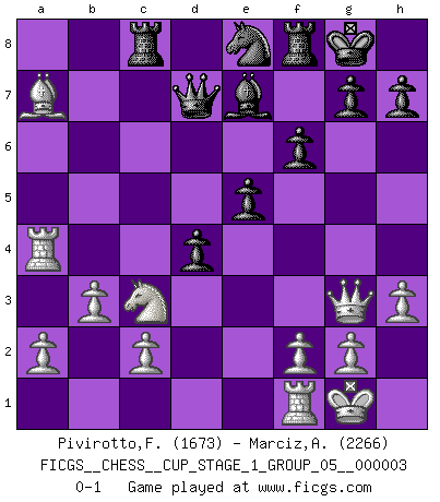 Last move : 0-1 2019 December 26 22:15:50 [Event "FICGS__CHESS__CUP_STAGE_1_GROUP_05__000003"] [Site "FICGS"] [Date "2019.11.02"] [Round "1"] [White "Pivirotto,Filiberto"] [Black "Marciz,Alexander"] [Result "0-1"] [WhiteElo "1673"] [BlackElo "2266"] 1.d4 Nf6 2.Nc3 d5 3.Nf3 c5 4.Bf4 Nc6 5.e3 Bg4 6.Bb5 e6 7.h3 cxd4 8.Bxc6+ bxc6 9.exd4 Bxf3 10.Qxf3 Rc8 11.O-O c5 12.Rad1 cxd4 13.Rxd4 Be7 14.Be5 O-O 15.Qg3 Ne8 16.Ra4 f6 17.Bd4 e5 18.Bxa7 Qd7 19.b3 d4 0-1 This chess game has been lost on time (started : 2019.11.02 13:52:28) Queen's pawn game Kingside Castling by player White (move 11) Kingside Castling by player Black (move 14) Player Black won this chess game. Follow this game move after move (download)In Fischer's hands, a slight theoretical advantage is as good a being a Queen ahead. (Isaac Kashdan) Ich kenne keine einzige Person, die behaupten würde, Garri Kasparow sei ein guter Mensch (Nigel Short) Un jugador que es sorprendido, esta derrotado a medias. (Proverbio) Botvinnik disait en comparant les échecs à la musique: Il existe une science dont le but est l'étude de l'acoustique et des sons. Mais il y a aussi un art qui se sert de l'océan des sons : c'est la musique. De toute évidence, il en est de même pour la pensée. La logique est l'étude des lois de la réflexion et les échecs reflètent, en tant qu'art, le côté logique de la réflexion, sous la forme d'images artistiques... Extrait de Fischer - Spassky, Reykjavik 1972 par Alexander & F. Wyndham (Ed. Solar), p 37. Quotation,n.: The act of repeating erroneously the words of another. The words erroneously repeated. (Ambrose Bierce, The Devil's Dictionary)