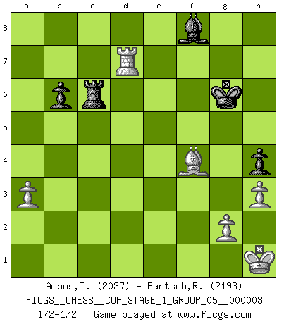 Last move : 1/2-1/2 2020 February 10 18:16:54 [Event "FICGS__CHESS__CUP_STAGE_1_GROUP_05__000003"] [Site "FICGS"] [Date "2019.11.02"] [Round "1"] [White "Ambos,Ilmar"] [Black "Bartsch,Reinhard Andrea"] [Result "1/2-1/2"] [WhiteElo "2037"] [BlackElo "2193"] 1.d4 Nf6 2.c4 e6 3.Nf3 b6 4.Nc3 Bb7 5.a3 d5 6.cxd5 Nxd5 7.Qc2 Be7 8.e4 Nxc3 9.bxc3 h6 10.Bc4 O-O 11.O-O c5 12.Re1 Nd7 13.Bf4 cxd4 14.cxd4 Nf6 15.Bd3 Qd7 16.h3 Rfc8 17.Qb3 Nh5 18.Be3 Nf6 19.Bc1 Bc6 20.Qd1 Bb5 21.Bb1 Ba4 22.Qe2 Bb5 23.Qe3 Bf8 24.Ne5 Qe7 25.Bb2 Nd7 26.Nd3 Qg5 27.f4 Qh4 28.Qf3 Bc4 29.f5 exf5 30.Qxf5 Nf6 31.e5 Nd5 32.Qf3 Rc7 33.Re4 Qe7 34.Rg4 g6 35.e6 Qxe6 36.Ne5 h5 37.Rg3 Bg7 38.Bxg6 fxg6 39.Rxg6 Qe8 40.Nxc4 Qxg6 41.Qxd5+ Kh7 42.Qxa8 Rxc4 43.Re1 Rc2 44.Bc1 Bxd4+ 45.Kh1 Bg7 46.Bf4 Qc6 47.Qxc6 Rxc6 48.Re7 Kg6 49.Rxa7 h4 50.Rd7 Bf8 1/2-1/2 Queen's Indian : 4.Nc3 Kingside Castling by player Black (move 10) Kingside Castling by player White (move 11) This chess game ended in a draw. Follow this game move after move (download)By the beauty of his games, the clarity of his play, and the brilliance of his ideas, Fischer made himself an artist of the same stature as Brahms, Rembrandt, and Shakespeare. (David Levy) Das Blackmar-Diemer-Gambit verändert den ganzen Menschen! (Emil Joseph Diemer) Yo siempre he tenido un ligero sentimiento de lástima por una persona que no tiene conocimiento del Ajedrez. (Siegbert Tarrasch) En blitz, le Cavalier l'emporte sur le Fou. (Vlastimil Hort) A good teacher is like a candle - it consumes itself to light the way for others. (Author unknown)