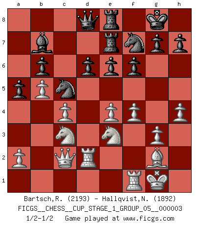 Last move : 1/2-1/2 2020 February 9 23:18:21 [Event "FICGS__CHESS__CUP_STAGE_1_GROUP_05__000003"] [Site "FICGS"] [Date "2019.11.02"] [Round "1"] [White "Bartsch,Reinhard Andrea"] [Black "Hallqvist,Niklas"] [Result "1/2-1/2"] [WhiteElo "2193"] [BlackElo "1892"] 1.c4 b6 2.d4 e6 3.e4 Bb4+ 4.Bd2 Bxd2+ 5.Nxd2 Ne7 6.g3 c5 7.Ne2 cxd4 8.Nxd4 O-O 9.Bg2 d6 10.O-O Nbc6 11.Nc2 Ba6 12.b4 Bb7 13.Rc1 a5 14.b5 Ne5 15.Qe2 Qc7 16.Ne3 Nd7 17.Rfd1 Rad8 18.Nb1 Nc5 19.Nc3 Ng6 20.Rd2 Rfe8 21.Rcd1 f6 22.Rd4 Ne5 23.h3 Kh8 24.Qd2 Nf7 25.Qc2 Qb8 26.Kh2 Qa8 27.R4d2 Kg8 28.f3 Qc8 29.Re1 Re7 30.f4 Qc7 31.Red1 Nh6 32.Re2 Bc8 33.h4 Rf8 34.Bh3 Nf7 35.Red2 Rd8 36.Bg2 Bb7 37.Bf3 Kh8 38.Kg1 Ra8 39.Bg2 R7e8 40.Na4 Red8 41.Nc3 Rd7 42.Rf1 Kg8 43.Rdf2 Re8 44.Ng4 Rde7 45.Ne3 Qd8 46.Rd2 1/2-1/2 English Opening Kingside Castling by player Black (move 8) Kingside Castling by player White (move 10) This chess game ended in a draw. Follow this game move after move (download)The only thing Chess players have in common is Chess. (Lodewijk Prins) Frage: Wie viele Autos haben Sie schon zerstört? - Antwort: Nur zwei. (Loek van Wely) De todos mis libros Rusos, la defensa contiene y difunde el 'calor' mas grande que pudiese verse extraño al observar lo supremamente abstracto que el Ajedrez supuestamente es. (Vladimir Nabokov) Ce n'est pas pour s'amuser qu'il joue aux échecs : il célèbre un culte. (Vladimir Nabokov) Life is verb, not a noun. (Charlotte Perkins Gilman)
