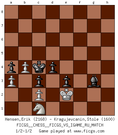 Last move : 1/2-1/2 2007 December 6 17:8:30 [Event "FICGS__CHESS__FICGS_VS_IGAME_RU_MATCH"] [Site "FICGS"] [Date "2007.06.27"] [Round "1"] [White "Hensen,Erik"] [Black "Kragujevcanin,Stole"] [Result "1/2-1/2"] [WhiteElo "2168"] [BlackElo "1600"] 1.e4 c5 2.Nf3 d6 3.d4 cxd4 4.Nxd4 Nf6 5.Nc3 a6 6.Bg5 e6 7.f4 Qc7 8.Qf3 b5 9.Bxf6 gxf6 10.e5 d5 11.exf6 b4 12.Nce2 Nd7 13.f5 e5 14.Ne6 fxe6 15.fxe6 Nxf6 16.Qxf6 Bg7 17.Qf5 Rf8 18.Qh5+ Kd8 19.g3 Bxe6 20.Bh3 Bg8 21.O-O-O Qd6 22.Qg4 Bh8 23.Qh5 Rf2 24.Rdf1 Rxf1+ 25.Rxf1 Kc7 26.Kb1 e4 27.Qg5 Re8 28.Qd2 d4 29.Nf4 Qc5 30.Re1 Qc4 31.b3 Qc3 32.Qxc3+ bxc3 33.Bf5 e3 34.Bd3 Be5 35.Ne2 a5 36.Rf1 Kd6 37.Rf5 Be6 38.Rh5 Bg4 39.Rh6+ Re6 40.Rxe6+ Kxe6 41.Kc1 h5 42.Bc4+ Kd6 43.Bd3 Kd5 44.Kd1 h4 45.Ke1 hxg3 46.hxg3 Bd6 47.Kf1 Bf3 48.Nf4+ Ke5 49.Ke1 Be4 50.Ng6+ Kd5 51.Ke2 Bxd3+ 52.Kxd3 Bxg3 53.Ne7+ Kc5 54.a3 a4 55.b4+ Kb6 56.Nd5+ Ka6 57.Ne7 Kb7 58.Nf5 Be5 59.Nh4 Kc6 60.Nf3 Kd5 61.Ng1 Bc7 62.Ne2 Bb6 63.Nf4+ Ke5 64.Ne2 Kf5 65.Nc1 Kf4 66.Ke2 Ke4 67.Nd3 Ba7 68.Nc1 Bb8 69.Nd3 Bd6 70.Nc1 Be7 71.Nd3 Kd5 72.Nc1 Kc4 73.Nd3 Bd6 74.Nc1 Bg3 1/2-1/2 Sicilian : Najdorf, 7.f4 Queenside Castling by player White (move 21) This chess game ended in a draw. Follow this game move after move (download)After black's reply to 1.e4 with 1..e5, leaves him always trying to get into the game. (Howard Staunton) Es genügt nicht ein guter Spieler zu sein, man muß auch gut spielen. (Siegbert Tarrasch) Un buen sacrificio es aquel que aunque no sea necesariamente sólido, deja a tu oponente aturdido y confuso. (Rudolph Spielmann) Les échecs, c'est l'art d'analyser. (Mikhail Botvinnik) Memory... is the diary that we all carry with us. (Oscar Wilde, The Importance of Being Earnest)