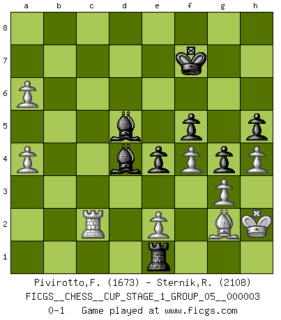 Last move : 0-1 2020 February 21 20:57:0 [Event "FICGS__CHESS__CUP_STAGE_1_GROUP_05__000003"] [Site "FICGS"] [Date "2019.11.02"] [Round "1"] [White "Pivirotto,Filiberto"] [Black "Sternik,Ryszard"] [Result "0-1"] [WhiteElo "1673"] [BlackElo "2108"] 1.d4 Nf6 2.Nc3 d5 3.Nf3 g6 4.g3 Bg7 5.Bg2 O-O 6.O-O c6 7.a3 Nbd7 8.Bf4 h6 9.Rb1 Ne4 10.Nxe4 dxe4 11.Ne5 g5 12.Nxd7 Qxd7 13.Be3 f5 14.f4 g4 15.Qd2 b6 16.c4 Ba6 17.Rbc1 Rad8 18.Rfd1 e6 19.Qb4 Rf7 20.Qa4 Qc8 21.Rd2 c5 22.d5 exd5 23.cxd5 Rd6 24.b4 Rc7 25.h3 h5 26.h4 c4 27.b5 c3 28.R2d1 Bb7 29.Qxa7 Bxd5 30.Qa6 Qe6 31.Kh2 Kh7 32.a4 c2 33.Rd2 Rc3 34.Bxb6 Rxb6 35.Qa7 Rb7 36.Qa6 Qxa6 37.bxa6 Rb1 38.R1xc2 Rxc2 39.Rxc2 Bd4 40.Rc7+ Kg6 41.Rc8 Re1 42.Rc2 Kf7 0-1 Queen's pawn game Kingside Castling by player Black (move 5) Kingside Castling by player White (move 6) Player Black won this chess game. Follow this game move after move (download)The passion for playing Chess is one of the most unaccountable in the world. (H.G. Wells) Kostenjuk hat keinen Sexappeal. (Loek van Wely) Bobby Fischer es el jugador de Ajedrez mas grande que jamás haya existido. (Ken Smith) On peut tirer plus d'utilité d'une partie perdue que de 100 parties gagnées. (Capablanca) There are 10 types of people in this world: those who understand binary and those who don't. (Anonymous)