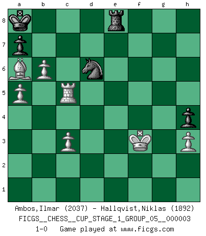 Last move : 1-0 2020 March 3 22:1:38 [Event "FICGS__CHESS__CUP_STAGE_1_GROUP_05__000003"] [Site "FICGS"] [Date "2019.11.02"] [Round "1"] [White "Ambos,Ilmar"] [Black "Hallqvist,Niklas"] [Result "1-0"] [WhiteElo "2037"] [BlackElo "1892"] 1.d4 e6 2.c4 b6 3.Nc3 Bb4 4.e4 Bb7 5.f3 Qh4+ 6.g3 Bxc3+ 7.bxc3 Qe7 8.Bd3 d6 9.Ne2 Nf6 10.Be3 c5 11.Nf4 Nc6 12.O-O h6 13.Ng2 O-O-O 14.Rb1 Kb8 15.Rb2 Rhe8 16.Re1 g5 17.f4 Rg8 18.d5 Na5 19.Rf2 gxf4 20.Bxf4 Ng4 21.Rf3 h5 22.Qe2 f6 23.h3 Ne5 24.Bxe5 dxe5 25.Ne3 Rg6 26.Kh2 Bc8 27.Qf2 Rf8 28.Bf1 Nb7 29.a4 Qe8 30.Qc2 Rg7 31.Bg2 Qg6 32.dxe6 Bxe6 33.Nd5 h4 34.g4 Na5 35.Ref1 Rgf7 36.Qd3 Kb7 37.Rb1 Ka8 38.Rf5 Qg7 39.Rh5 Rh8 40.Kh1 Qf8 41.Rg1 Qe8 42.Kh2 Qf8 43.Bf3 Nb7 44.Be2 Qg7 45.Qe3 R7f8 46.Rxh8 Rxh8 47.g5 fxg5 48.Rxg5 Qd7 49.Bg4 Nd8 50.Bf5 Qb7 51.Rg6 Bxd5 52.exd5 Rf8 53.Qxe5 Qf7 54.Be4 Re8 55.Qf5 Kb8 56.Rg4 Qxf5 57.Bxf5 Rh8 58.Bg6 Kb7 59.Re4 Rh6 60.Bf5 Rh5 61.Re7+ Kb8 62.Bd7 Nb7 63.Bb5 Nd6 64.Ba6 Rh8 65.Rd7 Ne4 66.Rb7+ Ka8 67.Re7 Nd6 68.Kg2 Rf8 69.Rd7 Ne4 70.d6 Nf6 71.Re7 Kb8 72.Rc7 Rd8 73.Rb7+ Ka8 74.Rf7 Nd7 75.Kf2 Ne5 76.Re7 Ng6 77.Rc7 Ne5 78.Ke3 b5 79.cxb5 Nc4+ 80.Kf4 Nxd6 81.Rxc5 Re8 82.a5 Re4+ 83.Kf3 Re8 84.b6 1-0 Queen's pawn : Keres defense Kingside Castling by player White (move 12) Queenside Castling by player Black (move 13) Player White won this chess game. Follow this game move after move (download)We must make sure that Chess will not be like a dead language, very interesting, but for a very small group. (Sytze Faber) Schach ist mein Leben, meine Leidenschaft, was ich gelernt habe und seit meinem 14. Lebensjahr profimässig praktiziere. Darauf zu verzichten, würde mir sehr schwer fallen. (Viktor Kortschnoi) Cuando le juegas a Fischer, no es una cuestion de si vas a ganar o perder. Es una cuestion de si vas a sobrevivir. (Boris Spassky) Des points faibles ou des trous dans la position de l'adversaire doivent être occupés par des pièces et non pas par des pions. (Siegbert Tarrasch) All politicians must be presumed guilty until they are proven innocent. (Dinesh De Silva)