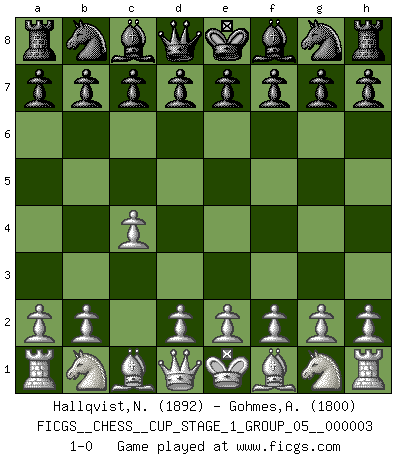 Last move : 1-0 2019 December 2 18:47:39 [Event "FICGS__CHESS__CUP_STAGE_1_GROUP_05__000003"] [Site "FICGS"] [Date "2019.11.02"] [Round "1"] [White "Hallqvist,Niklas"] [Black "Gohmes,Abdessamed"] [Result "1-0"] [WhiteElo "1892"] [BlackElo "1800"] 1.c4 1-0 This chess game has been lost on time (started : 2019.11.02 13:52:28) English Opening Player White won this chess game. Follow this game move after move (download)The King is a fighting piece. Use it ! (Wilhelm Steinitz) Schach ist die gewalttätigste aller Sportarten. (Garry Kasparov) El Ajedrez es un expediente tonto que hace creer a la gente inactiva que hacen una cosa muy astuta cuando solamente estan perdiendo su tiempo. (George Bernard Shaw) Les Echecs représentent une sphère d'idées créatrices basée sur la volonté des deux protagonistes. (Smyslov) Waiting for chance ? Play in casinos. (FICGS proverb)