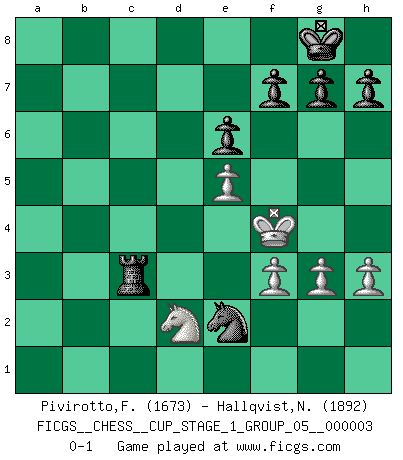 Last move : 0-1 2020 February 12 21:2:46 [Event "FICGS__CHESS__CUP_STAGE_1_GROUP_05__000003"] [Site "FICGS"] [Date "2019.11.02"] [Round "1"] [White "Pivirotto,Filiberto"] [Black "Hallqvist,Niklas"] [Result "0-1"] [WhiteElo "1673"] [BlackElo "1892"] 1.d4 e6 2.Nc3 Bb4 3.e3 Nf6 4.Nf3 b6 5.Bd2 Bb7 6.h3 Be7 7.Bb5 O-O 8.O-O d5 9.a3 c5 10.b3 c4 11.bxc4 a6 12.Ba4 dxc4 13.Qe2 Qc8 14.Rfb1 b5 15.Bxb5 axb5 16.Nxb5 Ne4 17.Bb4 Bxb4 18.Rxb4 Nc6 19.Rxc4 Ba6 20.Rb1 Bxb5 21.Rxb5 Qa6 22.a4 Na7 23.R5b4 Nd6 24.Ne5 Nxc4 25.Qxc4 Qxc4 26.Nxc4 Rfb8 27.Rb6 Rxb6 28.Nxb6 Rb8 29.a5 Nc8 30.Nd7 Rb1+ 31.Kh2 Rb2 32.a6 Rxc2 33.f3 Re2 34.e4 Rd2 35.Kg3 Rxd4 36.Nc5 Rd6 37.Kf4 Rc6 38.Nd3 Rxa6 39.Nc5 Ra2 40.g3 Ra3 41.Nd7 Nd6 42.Nb6 Nb5 43.Nc4 Rc3 44.Nd2 Nd4 45.e5 Ne2+ 0-1 Queen's pawn Kingside Castling by player Black (move 7) Kingside Castling by player White (move 8) Player Black won this chess game. Follow this game move after move (download)Do you realize Fischer almost never has any bad pieces? He exchanges them, and the bad pieces remain with his opponents. (Yuri Balashov) Man kann eine Schachpartie nur gewinnen, wenn das Gleichgewicht gestört ist. In einer Stellung mit ungestörtem Gleichgewicht ist auch das größte Genie hilflos - in der Stellung steckt dann eben kein genialer Einfall. (Wilhelm Steinitz) Aquel que toma al Peón de Caballo de la Reina, se pasará la noche a dormir en la calle. (Anónimo) Même un GMI sait rarement calculer sur plus de cinq coups une attaque à sacrifices. (Rudolf Spielmann) Crush them ! Make them suffer ! (General Grievous in Star Wars ep.3)