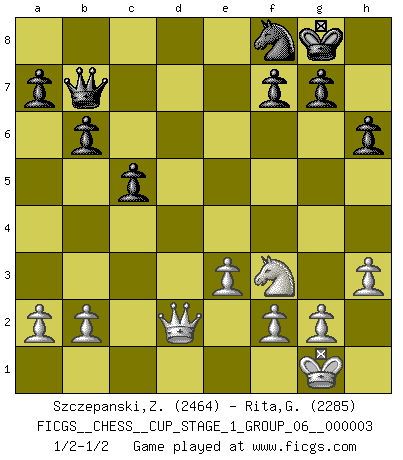 Last move : 1/2-1/2 2019 November 27 12:42:18 [Event "FICGS__CHESS__CUP_STAGE_1_GROUP_06__000003"] [Site "FICGS"] [Date "2019.11.02"] [Round "1"] [White "Szczepanski,Zbigniew"] [Black "Rita,Giacomo"] [Result "1/2-1/2"] [WhiteElo "2464"] [BlackElo "2285"] 1.Nf3 Nf6 2.c4 e6 3.Nc3 d5 4.d4 c6 5.Bg5 h6 6.Bxf6 Qxf6 7.e3 Nd7 8.Bd3 dxc4 9.Bxc4 Bd6 10.Ne4 Qe7 11.Nxd6+ Qxd6 12.O-O O-O 13.Rc1 b6 14.Nd2 Bb7 15.Be2 Rfd8 16.Bf3 e5 17.Re1 Qf6 18.Rc2 Nf8 19.dxe5 Qxe5 20.Qc1 Qc7 21.Rd1 c5 22.h3 Bxf3 23.Nxf3 Rxd1+ 24.Qxd1 Rd8 25.Qe2 Qb7 26.Rd2 Rxd2 27.Qxd2 1/2-1/2 Reti Opening Kingside Castling by player White (move 12) Kingside Castling by player Black (move 12) This chess game ended in a draw. Follow this game move after move (download)All I want to do, ever, is just play Chess. (Bobby Fischer) Ich trinke, ich rauche, ich spiele, ich liebe Frauen aber Fernschach ist ein Laster, das ich nicht habe. (Mikhail Nekhemyevich Tal) Si un gobernante no entiende al Ajedrez, ¿como puede governar él un reinado?. (El Rey Khusros II) Il vaut mieux sacrifier les pièces de l'adversaire. (Xavier Tartacover) Begin at the beginning and go on till you come to the end; then stop. (Lewis Carrol, Alice in Wonderland)