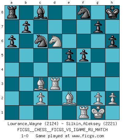 Last move : 1-0 2007 August 31 14:8:16 [Event "FICGS__CHESS__FICGS_VS_IGAME_RU_MATCH"] [Site "FICGS"] [Date "2007.06.27"] [Round "1"] [White "Lowrance,Wayne"] [Black "Silkin,Aleksey"] [Result "1-0"] [WhiteElo "2124"] [BlackElo "2221"] 1.e4 c5 2.Nf3 d6 3.d4 cxd4 4.Nxd4 Nf6 5.Nc3 a6 6.Bg5 e6 7.f4 Qb6 8.Qd2 Qxb2 9.Rb1 Qa3 10.e5 dxe5 11.fxe5 Nfd7 12.Ne4 h6 13.Bh4 Qxa2 14.Rd1 Qd5 15.Qe3 Qxe5 16.Be2 Bc5 17.Bg3 Bxd4 18.Rxd4 Qa5+ 19.Rd2 O-O 20.Bd6 Re8 21.O-O f5 22.Qg3 Kh8 23.Qg6 Rd8 24.Rd3 Nf8 25.Qf7 Nh7 26.Bc7 Rf8 27.Qxf8+ Nxf8 28.Bxa5 Nc6 29.Bc3 e5 30.Nd6 1-0 Comment by player 1 : Wayne Lowrance : test Sicilian : Najdorf, 7...Qb6 Kingside Castling by player Black (move 19) Kingside Castling by player White (move 21) Player White won this chess game. Follow this game move after move (download)Daring ideas are like Chess men moved forward. They may be beaten, but they may start a winning game. (Johann Wolfgang von Goethe) Schach ist ein schwarz-weisser Dschungel. (Garry Kasparov) ¿Cual es el objetivo de jugar una apertura de gambito?... Para adquirir una reputación de ser un jugador apuesto a costo de perder el juego. (Siegbert Tarrasch) Les Echecs ne sont pas pour les âmes timides. Ils requièrent un homme entier, qui ne s'arrête pas aveuglément à ce qui a été déjà établi, mais qui tente individuellement de sonder les profondeurs du jeu. (W. Steinitz) How many people work in NATO Headquarters ? - About half of them. (Dirk Stikker, NATO general secretary)