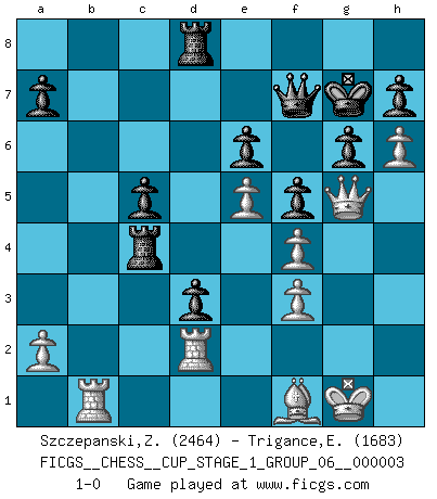 Last move : 1-0 2019 December 28 11:12:42 [Event "FICGS__CHESS__CUP_STAGE_1_GROUP_06__000003"] [Site "FICGS"] [Date "2019.11.02"] [Round "1"] [White "Szczepanski,Zbigniew"] [Black "Trigance,Emile"] [Result "1-0"] [WhiteElo "2464"] [BlackElo "1683"] 1.Nf3 d5 2.g3 Nf6 3.Bg2 c6 4.O-O Bg4 5.h3 Bxf3 6.exf3 g6 7.f4 Bg7 8.d4 e6 9.Nd2 O-O 10.Qe2 Nbd7 11.b3 c5 12.Bb2 Rc8 13.c4 b6 14.Rfd1 Re8 15.Rac1 Qe7 16.Nf3 Ne4 17.Ne5 Nxe5 18.dxe5 Rcd8 19.Qe1 Qb7 20.Rc2 f5 21.f3 Nxg3 22.Qxg3 d4 23.h4 Qf7 24.Bf1 Re7 25.Rg2 Kh8 26.b4 Red7 27.Ba3 Bf8 28.bxc5 Bxc5 29.Bxc5 bxc5 30.Rb1 d3 31.Rd2 Rd4 32.Qg5 Kg7 33.h5 Rxc4 34.h6+ 1-0 Reti : King's Indian attack, Yugoslav variation Kingside Castling by player White (move 4) Kingside Castling by player Black (move 9) Player White won this chess game. Follow this game move after move (download)It is not a move, even the best move that you must seek, but a realizable plan. (Eugene Znosko-Borovsky) Herr Iljumschinow ist ein etwas merkwürdiger Geschäftsmann: Er arbeitet zusammen mit Leuten wie Muammar al-Gaddafi; früher ist das Saddam Hussein gewesen. (Joel Lautier) El Jaque al descubierto es el bombardero del tablero. (Reuben Fine) Aidez vos pièces, elles vous aideront. (Paul Morphy) If you work for a living, why do you kill yourself working ? (Tuco to a chicken in The Good, The Bad and The Ugly)