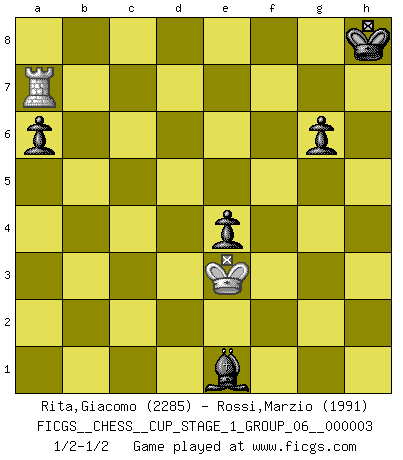 Last move : 1/2-1/2 2020 February 5 10:45:58 [Event "FICGS__CHESS__CUP_STAGE_1_GROUP_06__000003"] [Site "FICGS"] [Date "2019.11.02"] [Round "1"] [White "Rita,Giacomo"] [Black "Rossi,Marzio"] [Result "1/2-1/2"] [WhiteElo "2285"] [BlackElo "1991"] 1.e4 c5 2.Nf3 Nc6 3.d4 cxd4 4.Nxd4 Nf6 5.Nc3 e5 6.Ndb5 d6 7.Bg5 a6 8.Na3 b5 9.Bxf6 gxf6 10.Nd5 Bg7 11.Bd3 Ne7 12.Nxe7 Qxe7 13.c3 f5 14.O-O O-O 15.Nc2 d5 16.exf5 e4 17.Be2 Rd8 18.a4 bxa4 19.Rxa4 Bxf5 20.Nd4 Qg5 21.h4 Qf6 22.Bg4 Bxg4 23.Qxg4 Qg6 24.Qh3 Rab8 25.h5 Qf6 26.b4 Rb6 27.Qg4 Kh8 28.Ra5 Bh6 29.Rc5 Rg8 30.Rc8 Bf8 31.Qf5 Qg7 32.Qh3 Qg5 33.Nf5 Rf6 34.Ne3 d4 35.cxd4 Rh6 36.f4 Qxh5 37.Qxh5 Rxh5 38.Rc5 Rh6 39.Rf5 Bxb4 40.Rxf7 Rd8 41.Kf2 Rxd4 42.Nf5 Rd2+ 43.Ke3 Re6 44.Rc1 Rxg2 45.Rc8+ Rg8 46.R8c7 R8g6 47.Nh4 Rg3+ 48.Kf2 Rg4 49.f5 Re7 50.Ng6+ Rxg6 51.Rfxe7 Bxe7 52.fxg6 Bh4+ 53.Ke3 hxg6 54.Ra7 Be1 1/2-1/2 Sicilian : Pelikan (Lasker/Sveshnikov) variation Kingside Castling by player White (move 14) Kingside Castling by player Black (move 14) 10 pieces endgame at move 51 : White KRRP , Black KRBPPP WHITE : King + 2 Rooks 1 Pawn BLACK : King + 1 Rook 1 Bishop 3 Pawns 9 pieces endgame at move 51 : White KRP , Black KRBPPP WHITE : King + 1 Rook 1 Pawn BLACK : King + 1 Rook 1 Bishop 3 Pawns 8 pieces endgame at move 52 : White KRP , Black KBPPP WHITE : King + 1 Rook 1 Pawn BLACK : King + 1 Bishop 3 Pawns 7 pieces endgame at move 53 : White KR , Black KBPPP WHITE : King + 1 Rook BLACK : King + 1 Bishop 3 Pawns This chess game ended in a draw. Follow this game move after move (download)Chess is mental torture. (Garry Kasparov) Ohne Leiden bildet sich kein Charakter. (Ernst Freiherr von Feuchtersleben) Aquel que toma al Peón de Caballo de la Reina, se pasará la noche a dormir en la calle. (Anónimo) D'abord les bases : Jouez et étudiez, puis étudiez et jouez, ensuite jouez et étudiez, puis étudiez et jouez. Deuxièmement : Donnez toujours le meilleur de vous-même ! (Ken Smith) When you don't know what to do, walk fast and look worried. (Anonymous)
