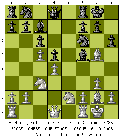 Last move : 0-1 2019 December 22 12:0:26 [Event "FICGS__CHESS__CUP_STAGE_1_GROUP_06__000003"] [Site "FICGS"] [Date "2019.11.02"] [Round "1"] [White "Bochatay,Felipe"] [Black "Rita,Giacomo"] [Result "0-1"] [WhiteElo "1912"] [BlackElo "2285"] 1.c4 Nf6 2.g3 c6 3.Bg2 e5 4.Nc3 Bc5 5.e3 O-O 6.Nge2 d5 7.d4 exd4 8.exd4 Bb6 9.c5 Bc7 10.O-O Bf5 11.Bg5 h6 0-1 This chess game has been lost on time (started : 2019.11.02 13:52:30) English, 1...Nf6 (Anglo-Indian defense) Kingside Castling by player Black (move 5) Kingside Castling by player White (move 10) Player Black won this chess game. Follow this game move after move (download)In the perfect Chess combination as in a first-rate short story, the whole plot and counter-plot should lead up to a striking finale, the interest not being allayed until the very last moment. (Yates and Winter) Ivan Sokolov treibt mich als Beifahrer an mit go Loeky go - . (Loek van Wely) Un entendimiento minucioso de las típicas continuaciones de mate hacen de las mas complicadas combinaciones de sacrificio que conducen hacia ellas no solo no dificiles, sino casi un asunto de rutina. (Siegbert Tarrasch) Les Echecs sont affaire de jugement sensible. Savoir quand frapper et quand esquiver. (Fischer) For peace of mind, resign as general manager of the universe. (Douglas Adams)