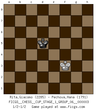 Last move : 1/2-1/2 2020 April 16 18:17:53 [Event "FICGS__CHESS__CUP_STAGE_1_GROUP_06__000003"] [Site "FICGS"] [Date "2019.11.02"] [Round "1"] [White "Rita,Giacomo"] [Black "Pechova,Hana"] [Result "1/2-1/2"] [WhiteElo "2285"] [BlackElo "1791"] 1.e4 c5 2.Nf3 Nc6 3.d4 cxd4 4.Nxd4 Nf6 5.Nc3 e5 6.Ndb5 d6 7.Bg5 a6 8.Na3 b5 9.Bxf6 gxf6 10.Nd5 f5 11.c3 Bg7 12.Bd3 Be6 13.Qh5 O-O 14.exf5 Bxd5 15.f6 e4 16.fxg7 Re8 17.Be2 Re5 18.Qh6 b4 19.Nc2 bxc3 20.bxc3 Qg5 21.Qxg5 Rxg5 22.O-O Be6 23.Rfd1 Rc5 24.Rxd6 Rxc3 25.Ne3 Nb4 26.a3 Nd3 27.h3 Kxg7 28.Bg4 Bxg4 29.hxg4 a5 30.Rd5 Kf8 31.Ra2 a4 32.Nf5 Re8 33.Ra5 Ne5 34.Ne3 Nc4 35.Rc5 Rxa3 36.Rxa3 Nxa3 37.Ra5 Kg7 38.Rxa4 Nb5 39.Rc4 Re5 40.Kh2 Kf6 41.Kh3 Kg5 42.Kg3 h6 43.Nf5 h5 44.f4+ exf3 45.gxf3 hxg4 46.f4+ Kxf5 47.fxe5 Na3 48.Rf4+ Kxe5 49.Rxf7 Nc2 50.Kxg4 Ne3+ 51.Kf3 Nd5 52.Ra7 Kd4 53.Rd7 Ke5 54.Ra7 Kd4 55.Rd7 Ke5 56.Rxd5+ Kxd5 1/2-1/2 Sicilian : Pelikan (Lasker/Sveshnikov) variation Kingside Castling by player Black (move 13) Kingside Castling by player White (move 22) 10 pieces endgame at move 45 : White KRNPP , Black KRNPP WHITE : King + 1 Rook 1 Knight 2 Pawns BLACK : King + 1 Rook 1 Knight 2 Pawns 9 pieces endgame at move 45 : White KRNP , Black KRNPP WHITE : King + 1 Rook 1 Knight 1 Pawn BLACK : King + 1 Rook 1 Knight 2 Pawns 8 pieces endgame at move 46 : White KRP , Black KRNPP WHITE : King + 1 Rook 1 Pawn BLACK : King + 1 Rook 1 Knight 2 Pawns 7 pieces endgame at move 47 : White KRP , Black KNPP WHITE : King + 1 Rook 1 Pawn BLACK : King + 1 Knight 2 Pawns 6 pieces endgame at move 48 : White KR , Black KNPP WHITE : King + 1 Rook BLACK : King + 1 Knight 2 Pawns 5 pieces endgame at move 49 : White KR , Black KNP WHITE : King + 1 Rook BLACK : King + 1 Knight 1 Pawn 4 pieces endgame at move 50 : White KR , Black KN WHITE : King + 1 Rook BLACK : King + 1 Knight 3 pieces endgame at move 56 : White KR , Black K WHITE : King + 1 Rook BLACK : King + 2 pieces endgame at move 56 : White K , Black K WHITE : King + BLACK : King + This chess game ended in a draw. Follow this game move after move (download)Chess demands total concentration. (Bobby Fischer) Im Schach gewinnt jeder. Hat man Freunde am Spiel - und das ist die Hauptsache - ist auch der Verlust einer Partie kein Unglück. (David Bronstein) Robert Fischer es la ley hacia si mismo. (Larry Evans) La tactique, c'est ce que vous faites quand il y a quelque chose à faire; la stratégie, c'est ce que vous faites quand il n'y a rien à faire. (Savielli Tartacower) I couldn't make any sense out of what this particular thread is about. It sounds like R2 D2 computer speaking. A space fight ?!? Some 'command' problems in Moscow ? Some killers & narcotic addicts attacking some game & a god wannabe ?? (Dinesh De Silva, lost in a russian conflict in FICGS forum)