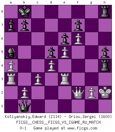 Last move : 0-1 2007 September 19 21:32:0 [Event "FICGS__CHESS__FICGS_VS_IGAME_RU_MATCH"] [Site "FICGS"] [Date "2007.06.27"] [Round "1"] [White "Kotlyanskiy,Edward"] [Black "Orlov,Vladimir"] [Result "0-1"] [WhiteElo "2114"] [BlackElo "1600"] 1.e4 e6 2.d4 d5 3.e5 c5 4.c3 Nc6 5.Nf3 Qb6 6.a3 c4 7.Nbd2 Na5 8.Be2 Bd7 9.O-O Ne7 10.Rb1 Qc7 11.Re1 Nc8 12.Nf1 Nb6 13.Bf4 h6 14.Qc1 O-O-O 15.Bd1 Kb8 16.h4 Ba4 17.Bxa4 Nxa4 18.h5 Be7 19.Bg3 Rdg8 20.Ne3 Nb3 21.Qc2 Nb6 22.Nd2 Na5 23.Ng4 Qd8 24.Qd1 g6 25.Ne3 Rg7 26.Qg4 Bg5 27.f4 gxh5 28.Qxh5 Be7 29.Bf2 Nb3 30.Nxb3 cxb3 31.Re2 Nc4 32.f5 Qg8 33.Rf1 Bd8 34.a4 R8h7 35.f6 Rg6 36.Qf3 Nxe3 37.Rxe3 Ba5 38.Ra1 Rg5 39.Ra3 h5 40.Bh4 Rg4 41.Qf2 Rh8 42.Rxb3 Qg6 43.Kh2 Qb1 44.Ra3 Rxh4+ 0-1 French : Advance, Paulsen attack Kingside Castling by player White (move 9) Queenside Castling by player Black (move 14) Player Black won this chess game. Follow this game move after move (download)Chess is like war on a board. (Bobby Fischer) Zeige mir drei Eröffnungsvarianten und ich beweise dir, dass zwei davon inkorrekt sind. (Emanuel Lasker) Puntos débiles o agujeros en la posición de tu oponente deben de ser ocupados por piezas, no Peones. (Siegbert Tarrasch) Des combinaisons [dans le jeu d'échecs] pareilles à des mélodies. Je crois entendre pour ainsi dire la musique des coups... (Vladimir Nabokov) Luck never gives; it only lends. (Swedish proverb)
