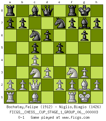 Last move : 0-1 2019 December 27 23:31:20 [Event "FICGS__CHESS__CUP_STAGE_1_GROUP_06__000003"] [Site "FICGS"] [Date "2019.11.02"] [Round "1"] [White "Bochatay,Felipe"] [Black "Niglio,Biagio"] [Result "0-1"] [WhiteElo "1912"] [BlackElo "1426"] 1.c4 c5 2.Nc3 Nc6 3.g3 g6 4.Bg2 Bg7 5.Nf3 e5 6.d3 Nge7 7.O-O O-O 8.Qc2 d6 0-1 This chess game has been lost on time (started : 2019.11.02 13:52:30) English : Symmetrical, Botvinnik system Reversed Kingside Castling by player White (move 7) Kingside Castling by player Black (move 7) Player Black won this chess game. Follow this game move after move (download)If your opponent cannot do anything active, then don't rush the position; instead you should let him sit there, suffer, and beg you for a draw. (Jeremy Silman) Privat ist Kortschnoi kein schlechter Mensch, sehr sympathisch. Aber während des Spiels ist er grausam. Er will dich töten. (Miguel Najdorf) Las piezas de Ajedrez son los bloques del alfabeto que moldean los pensamientos; y esos pensamientos, aunque hagan un diseño visual en el tablero, expresan abstractamente su belleza como un poema. (Marcel Duchamp) La tactique, c'est ce que vous faites quand il y a quelque chose à faire; la stratégie, c'est ce que vous faites quand il n'y a rien à faire. (Savielli Tartacower) Your best chance to get a Royal Flush in a casino is in the bathroom. (Anonymous)