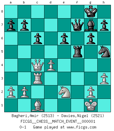 Last move : 0-1 2006 October 20 0:38:57 [Event "FICGS__CHESS__MATCH_EVENT__000001"] [Site "FICGS"] [Date "2006.06.19"] [Round "1"] [White "Bagheri,Amir"] [Black "Davies,Nigel"] [Result "0-1"] [WhiteElo "2513"] [BlackElo "2521"] 1.c4 g6 2.d4 f5 3.e4 fxe4 4.Nc3 Nf6 5.f3 exf3 6.Nxf3 Bg7 7.Bd3 d6 8.O-O O-O 9.Bg5 Nc6 10.Qb3 Bg4 11.Ne2 Qd7 12.h3 Bxf3 13.Rxf3 Nh5 14.Rxf8+ Rxf8 15.Qb5 Qc8 16.Qd5+ e6 17.Qe4 Nb4 18.Rd1 d5 19.Qe3 Nxd3 20.Qxd3 dxc4 21.Qxc4 Qd7 22.Rc1 c6 23.Rc3 Rf5 24.Bc1 Qf7 0-1 English Opening Kingside Castling by player White (move 8) Kingside Castling by player Black (move 8) Player Black won this chess game. Follow this game move after move (download)I am the best player in the world and I am here to prove it. (Bobby Fischer) Im Fernschach kannst du während dem Spiel rauchen. (John Christen Knudsen) Aquel que teme a un Peón de Reina aislado, debería de retirarse del Ajedrez. (Siegbert Tarrasch) La vie et les Echecs sont tous les deux une lutte constante. (Lasker) In my experience, there's no such thing as luck. (Obi-Wan Kenobi in Star Wars ep.4)